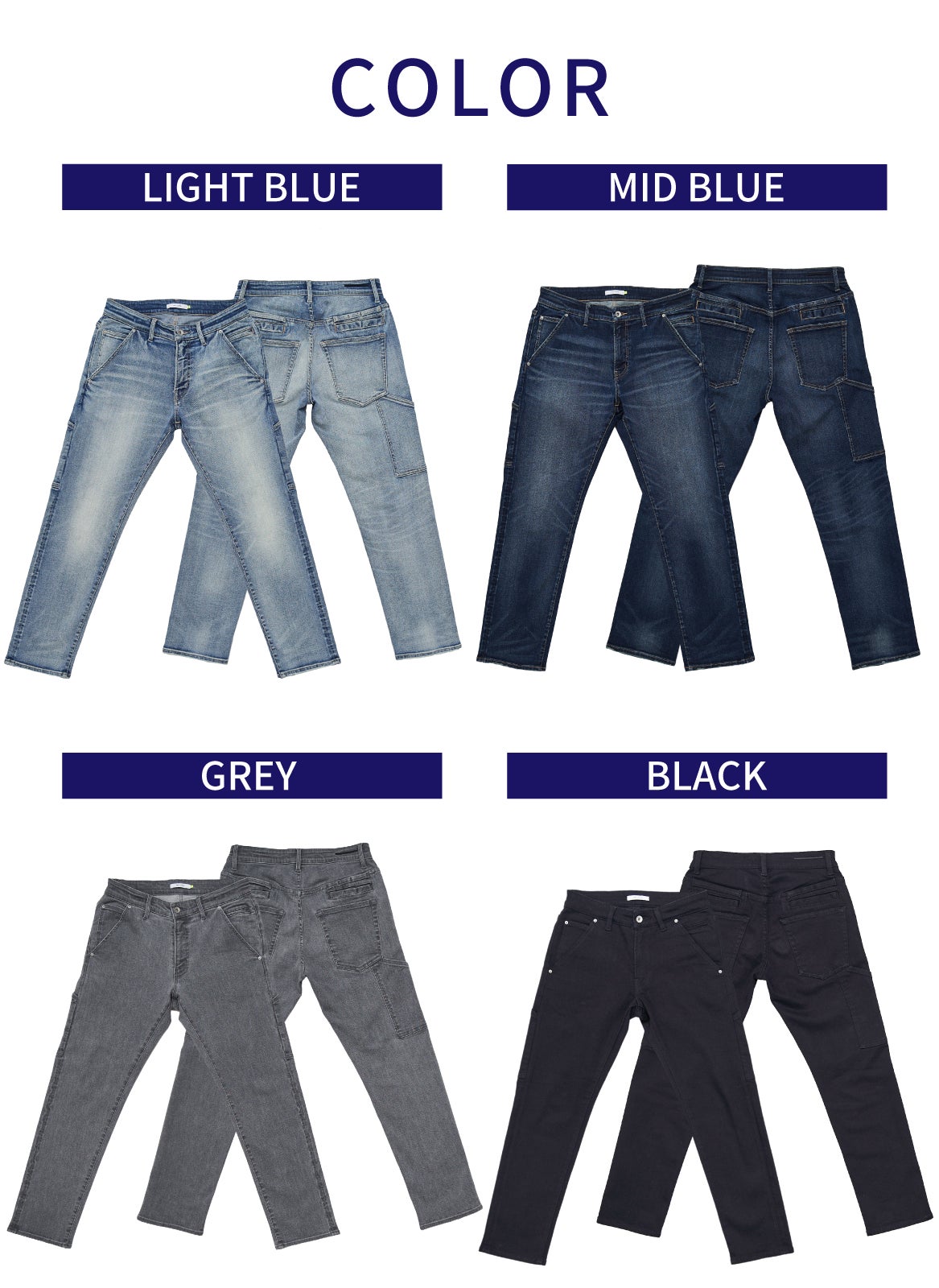 一般的なワークパンツよりも多い10個のポケットを搭載し、収納できる荷物の量は一般的なJEANSの2倍以上となっております!