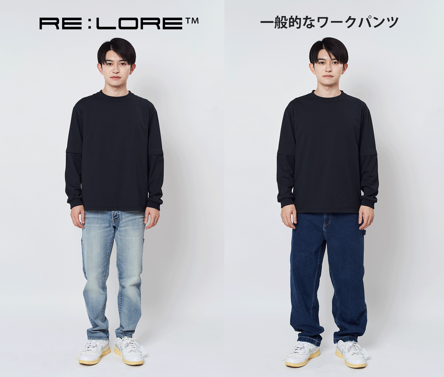 一般的なワークパンツは生地が伸びないため、動きやすさを考慮した太目のシルエットになっており、どうしても子供っぽい印象になりがちです。