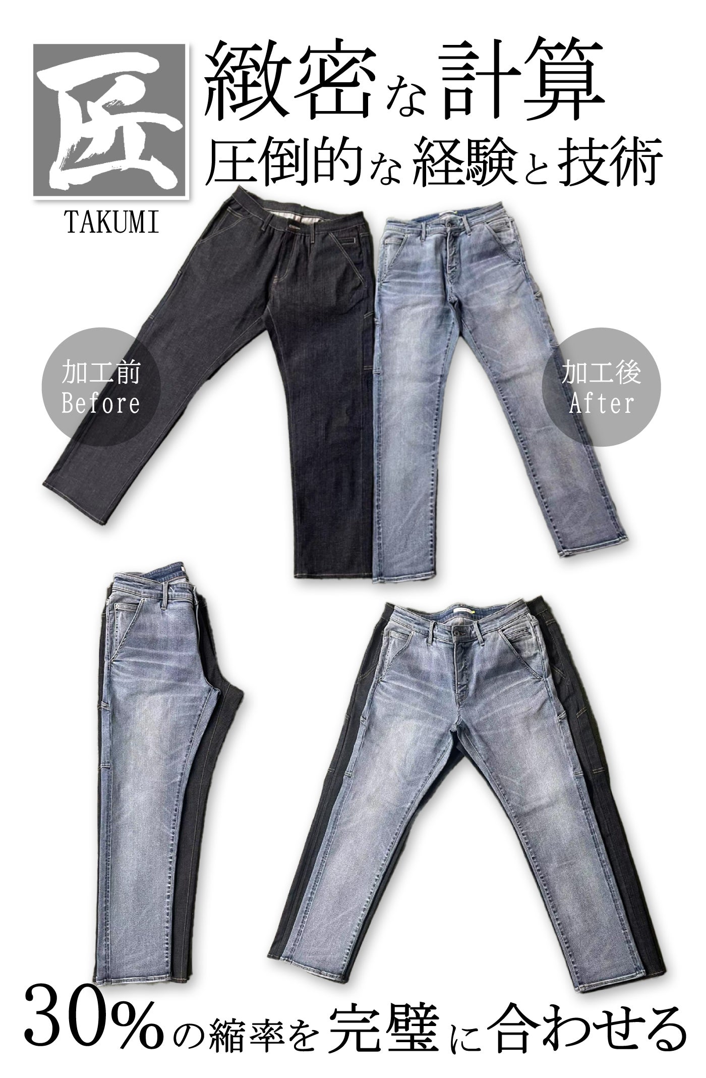 膝の前、脇、後ろと綺麗につながった穿きジワを忠実に再現した『匠の技』を是非ご堪能ください。
