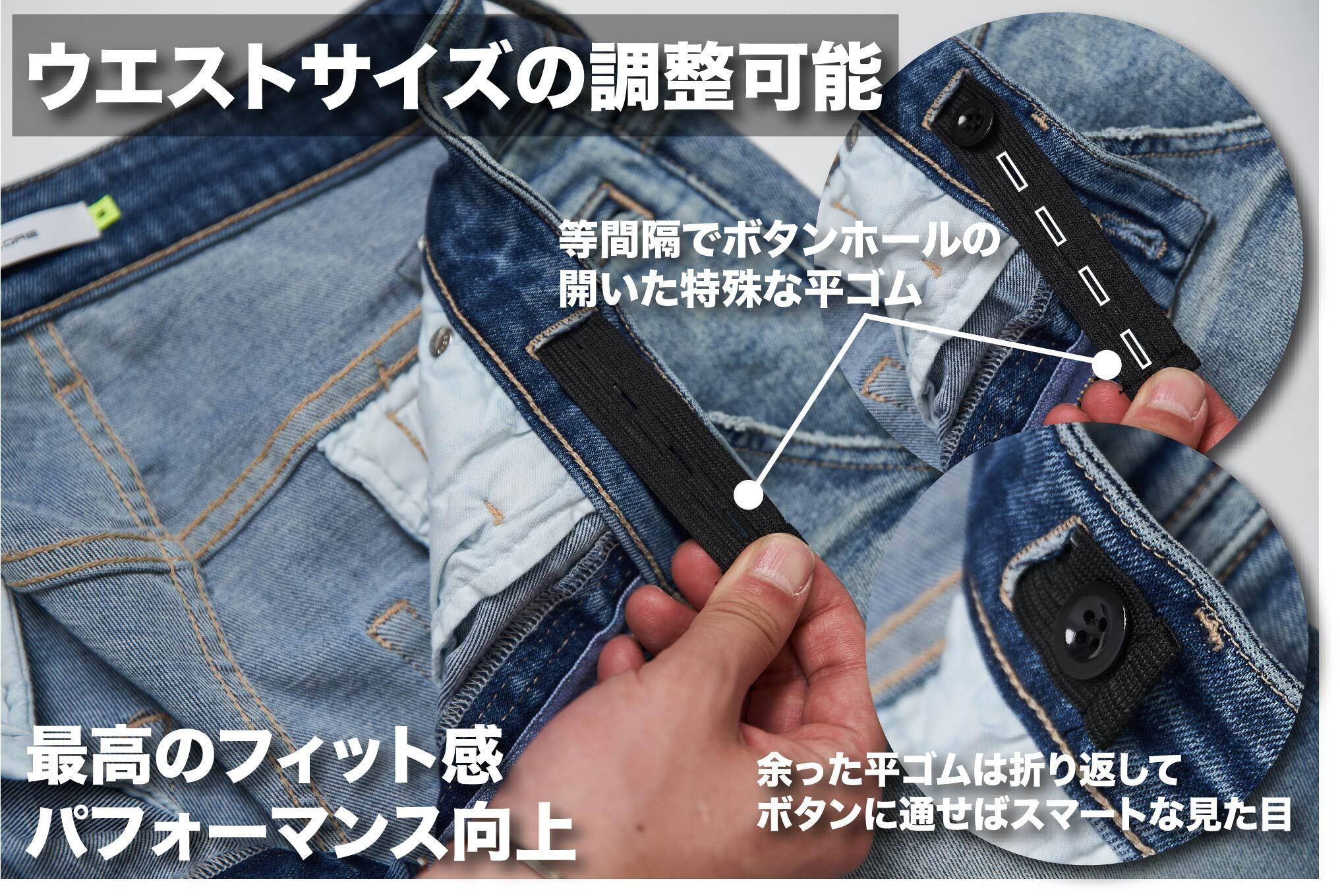 ベルト無しでウエストのサイズ調整が可能な独自構造。