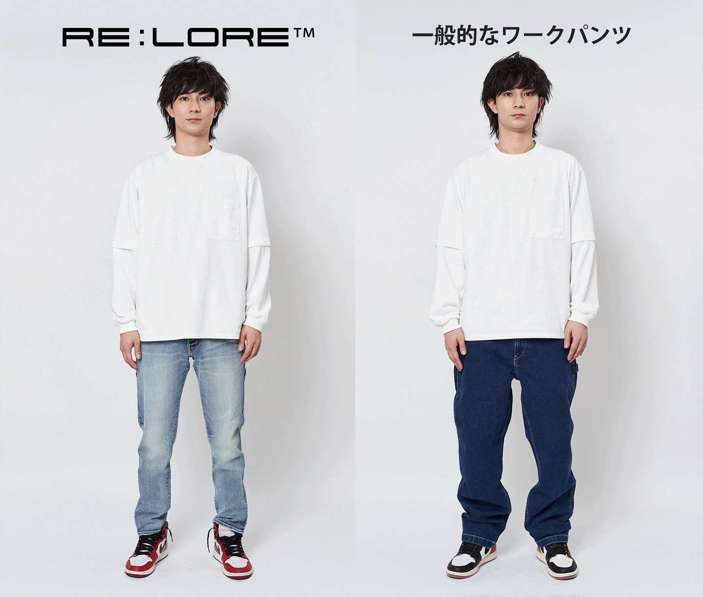 一般的なワークパンツは生地が伸びないため、動きやすさを考慮した太目のシルエットになっており、どうしても子供っぽい印象になりがちです。