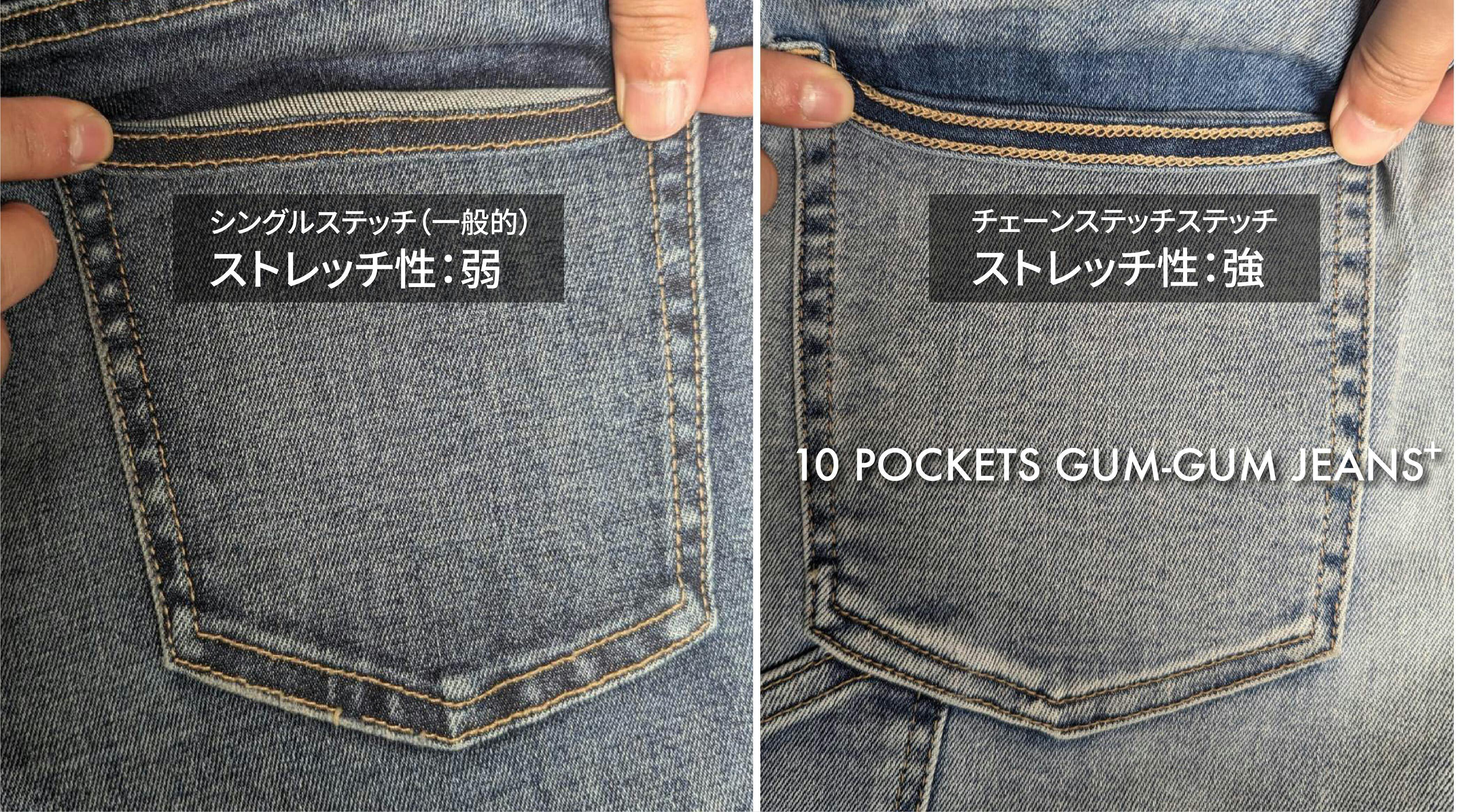 一般的なストレッチデニムの伸長率は15%〜30%程度なので、GUM-GUM JEANSはその4倍以上、驚異の伸長率:92.7%を実現しました。
