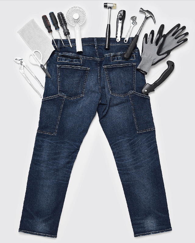 一般的なワークパンツよりも多い10個のポケットを搭載し、収納できる荷物の量は一般的なJEANSの2倍以上となっております!