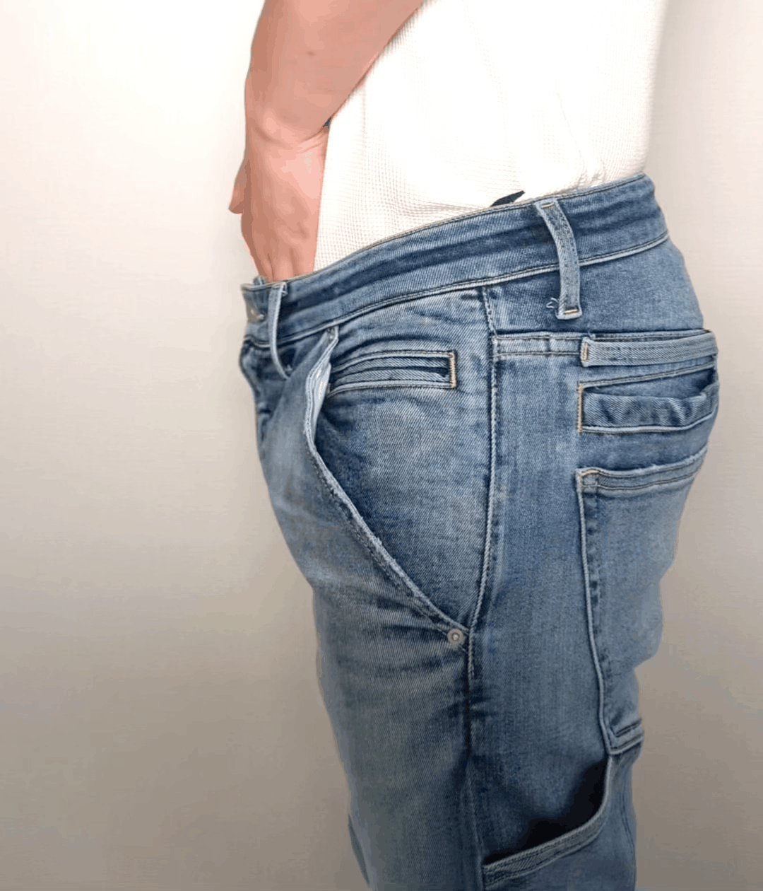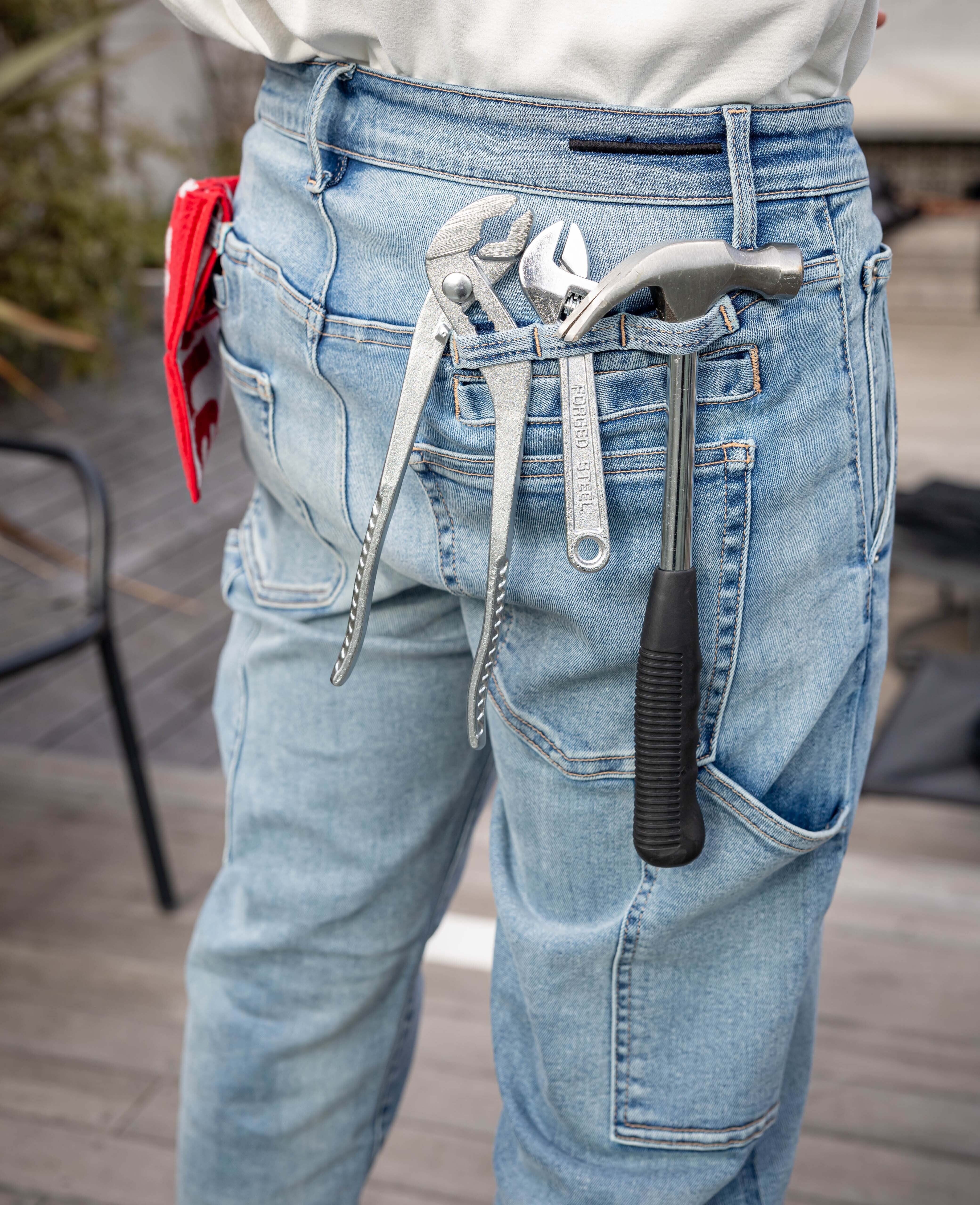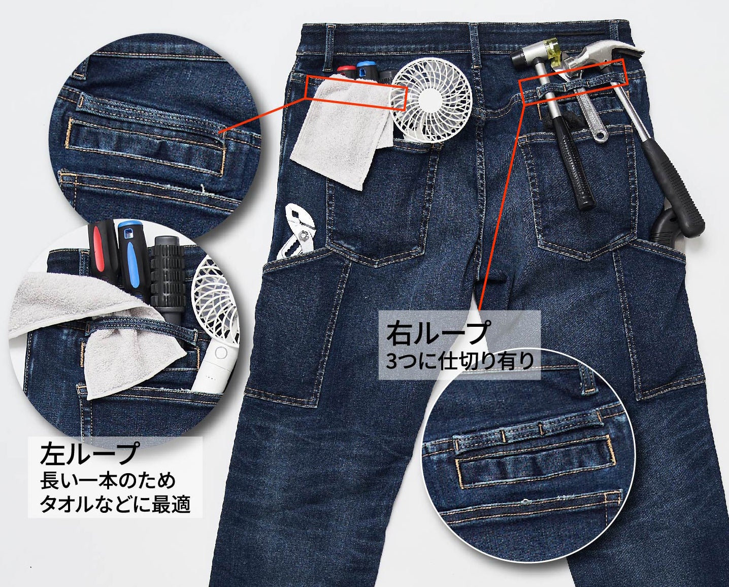 さらに、バックポケットの上に2本のループを左右対称に配置し、スタイリッシュな見た目をキープしつつ、一般的なハンマーループよりも利便性を向上させました。