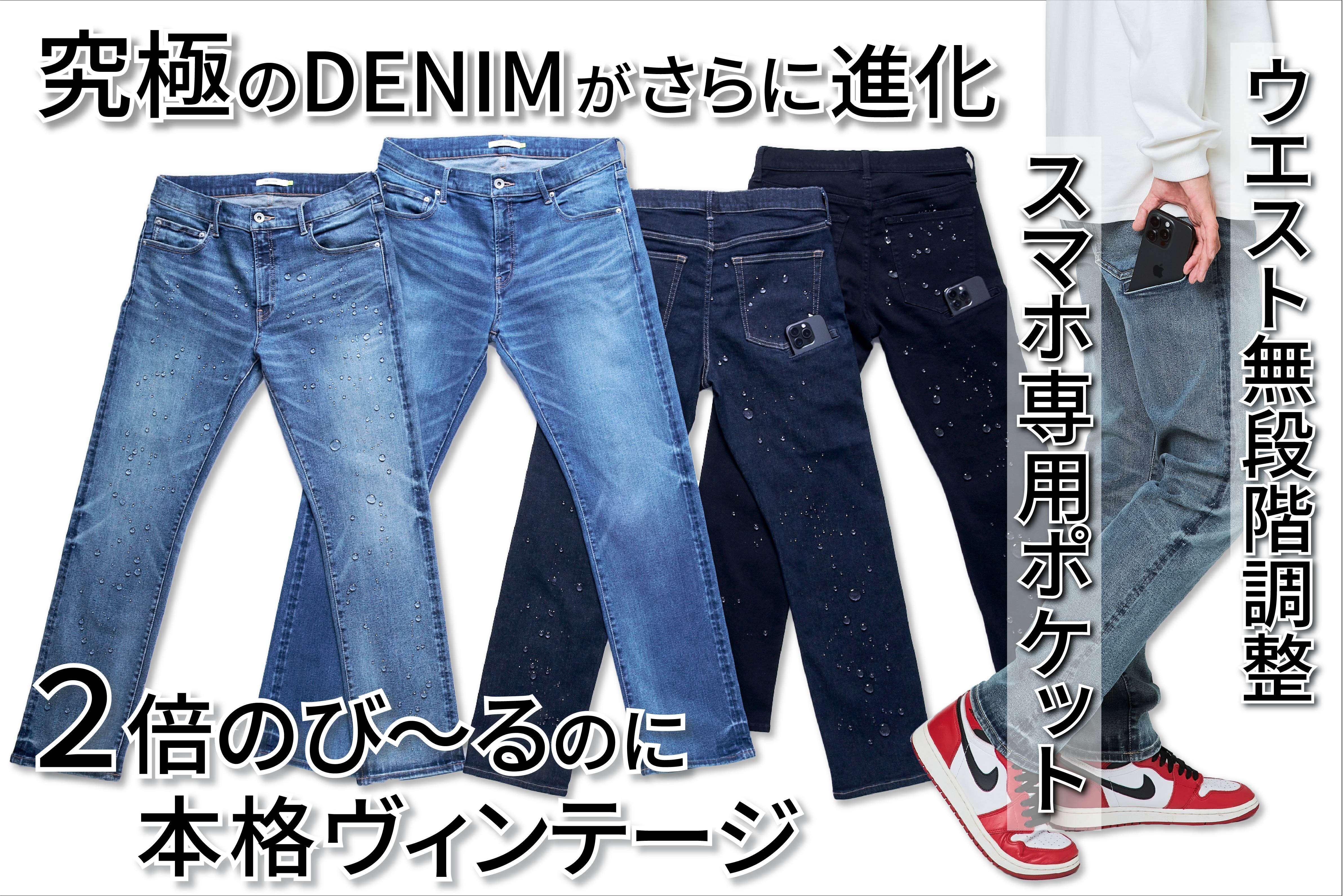 【限定100着】スマホに最適6ポケット/無段階ウエスト調整/2倍伸びる超撥水デニム