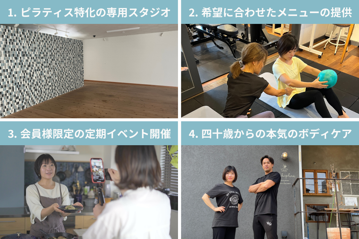 さらに、もっとピラティスを深く知りたい方向けにステップアップメニューの「パーソナルピラティス」を、減量や筋肉量増加をしたい方向けには「パーソナルの筋トレと食事指導」を、というように、希望に合わせた自由な選択ができるピラティススタジオを目指していきます。