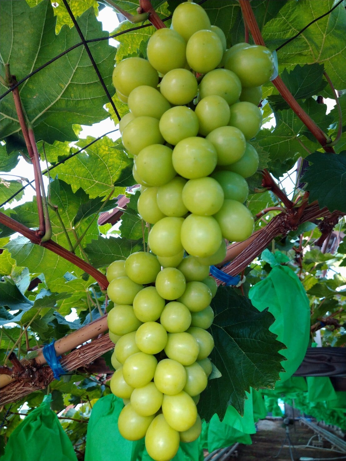 こんばんは!犬塚農園です!本日は岡山のとあるぶどう選果場(写真)へお勉強も兼ねて行ってまいりました。こちらには岡山県内の黒系ぶどう、赤系ぶどう、緑系ぶどうなど様々な品種が集まります。どれもこれも美味しそうー!でした。生産者さんとのお話の中で「今年は黒系ぶどうは色が付かんかったぁ~」と嘆かれる方が多かったです。※「色が付かんかったぁ~」とは「粒が黒くならんかったぁ~」ってことです。その原因はいろいろあるみたいですが(原因のご説明は省略します)私どものシャインマスカット(緑系ぶどう)でも粒の色付きにはとても気を使っております。写真を見ていただくとお分かりになると思いますが白袋と緑袋があると思います。この緑袋は白袋の上に緑袋をかけています。←通常1枚ですが2枚使用しています。なんでかと言いますと、房によって着色のスピードが違うからです。よーく確認しないとその変化に気が付きません。日々のぶどうハウスの散策が役に立っていますね!9月下旬になりましてだいぶ涼しくなりましたね。寒暖の差も出てきましたので更にぶどうの糖度(甘み)が増してくると思います。やったー!みなさま、季節の変わり目、体調管理はしっかりお願いします!!