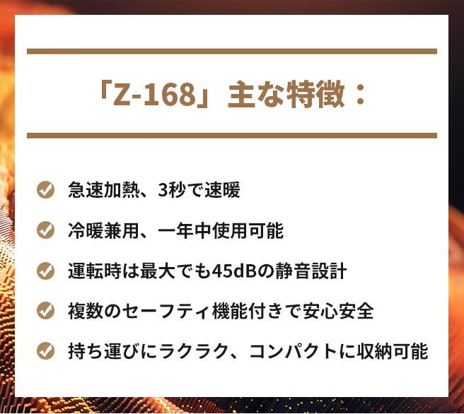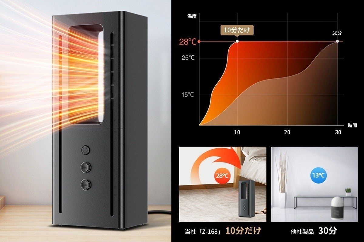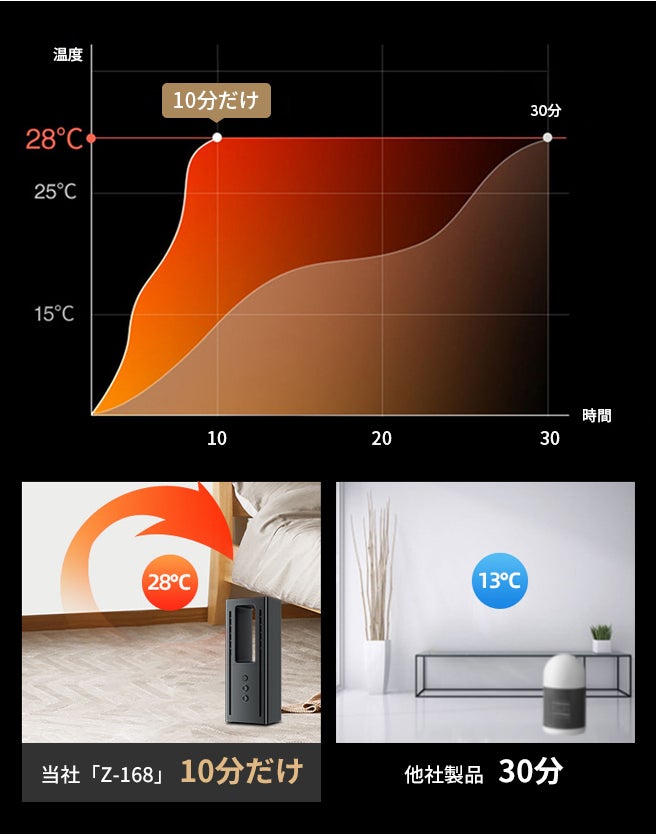 「Z-168」の速暖性に優れており、電源を入れると3秒速暖であっという間に暖かさをお届けします。