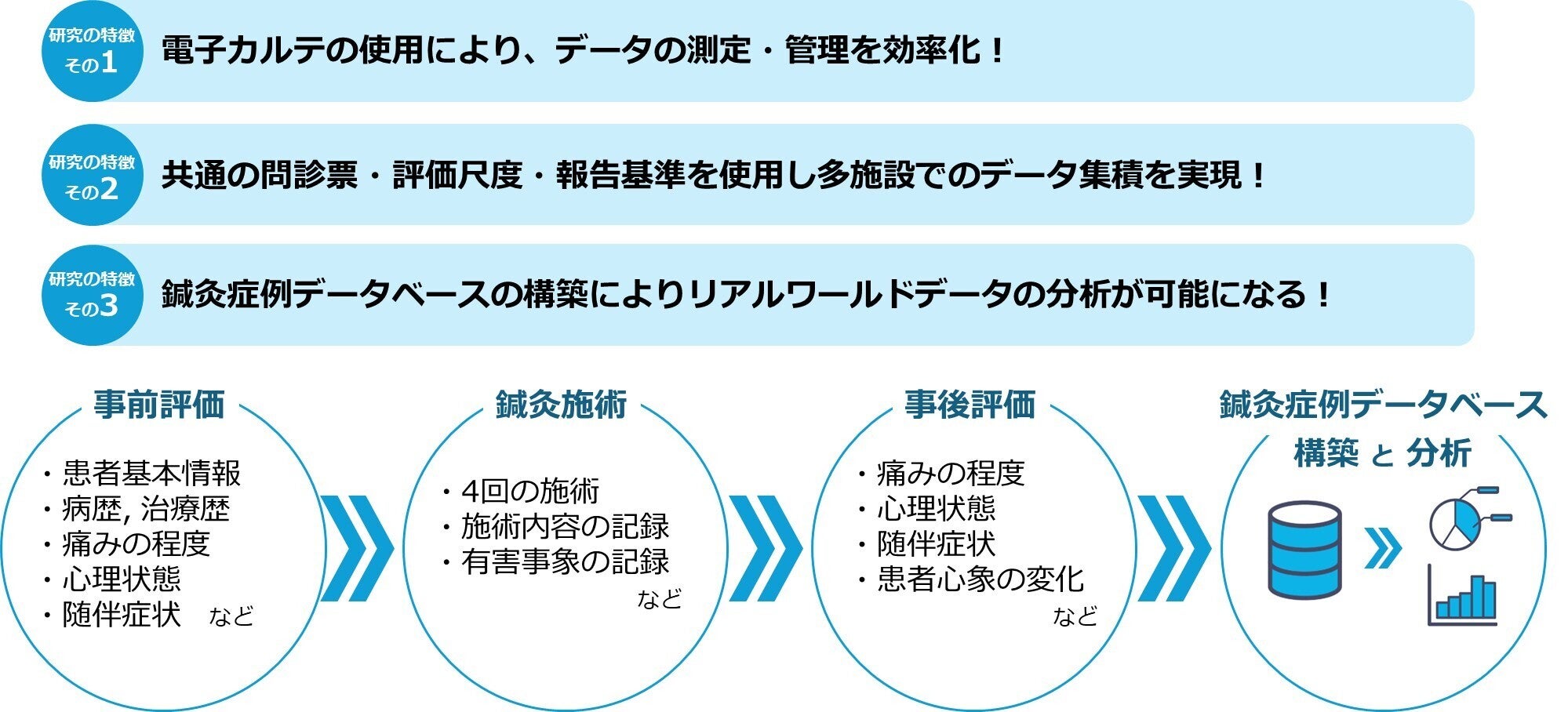当プロジェクトでは、電子カルテを活用し、鍼灸院で身近な症状である筋骨格痛を対象とした多施設臨床研究を実施します。痛みとメンタル不調は共存することが多く、心身両面からのアプローチが必要です。今回、多施設の鍼灸院でのリアルワールドデータを集積するためのシステムを構築し、筋骨格痛患者に対する鍼灸治療の可能性を探ります。