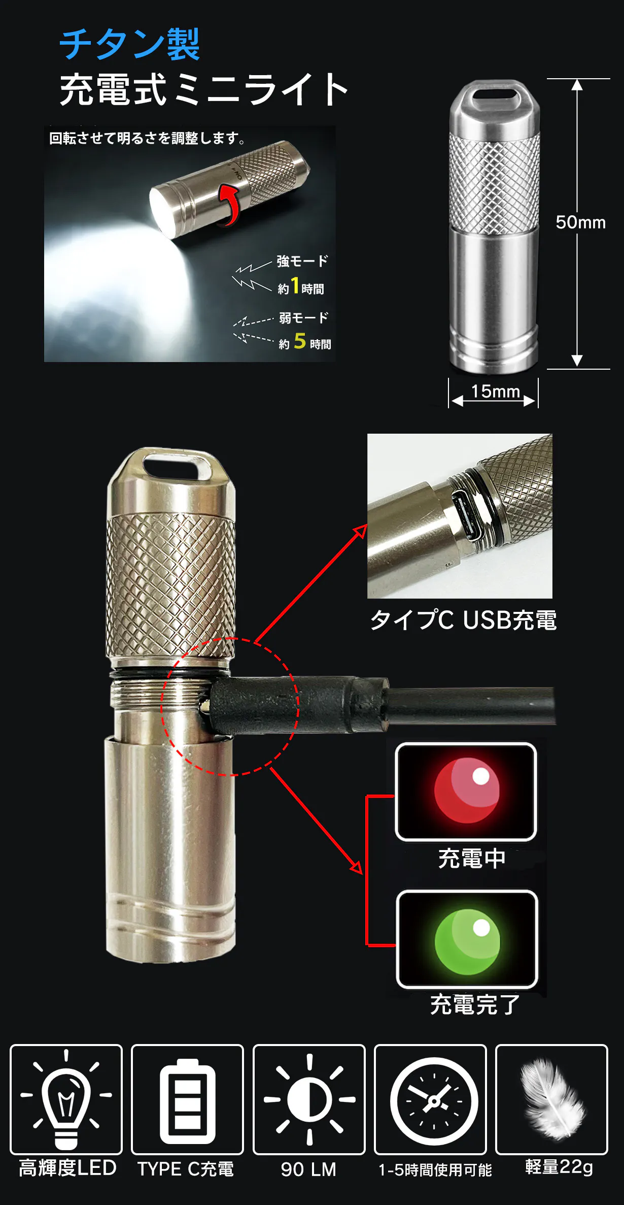 ◎チタン製充電式ミニライトキャンプシーン、夜の仕事帰りなどマグチコとセットなら安心。