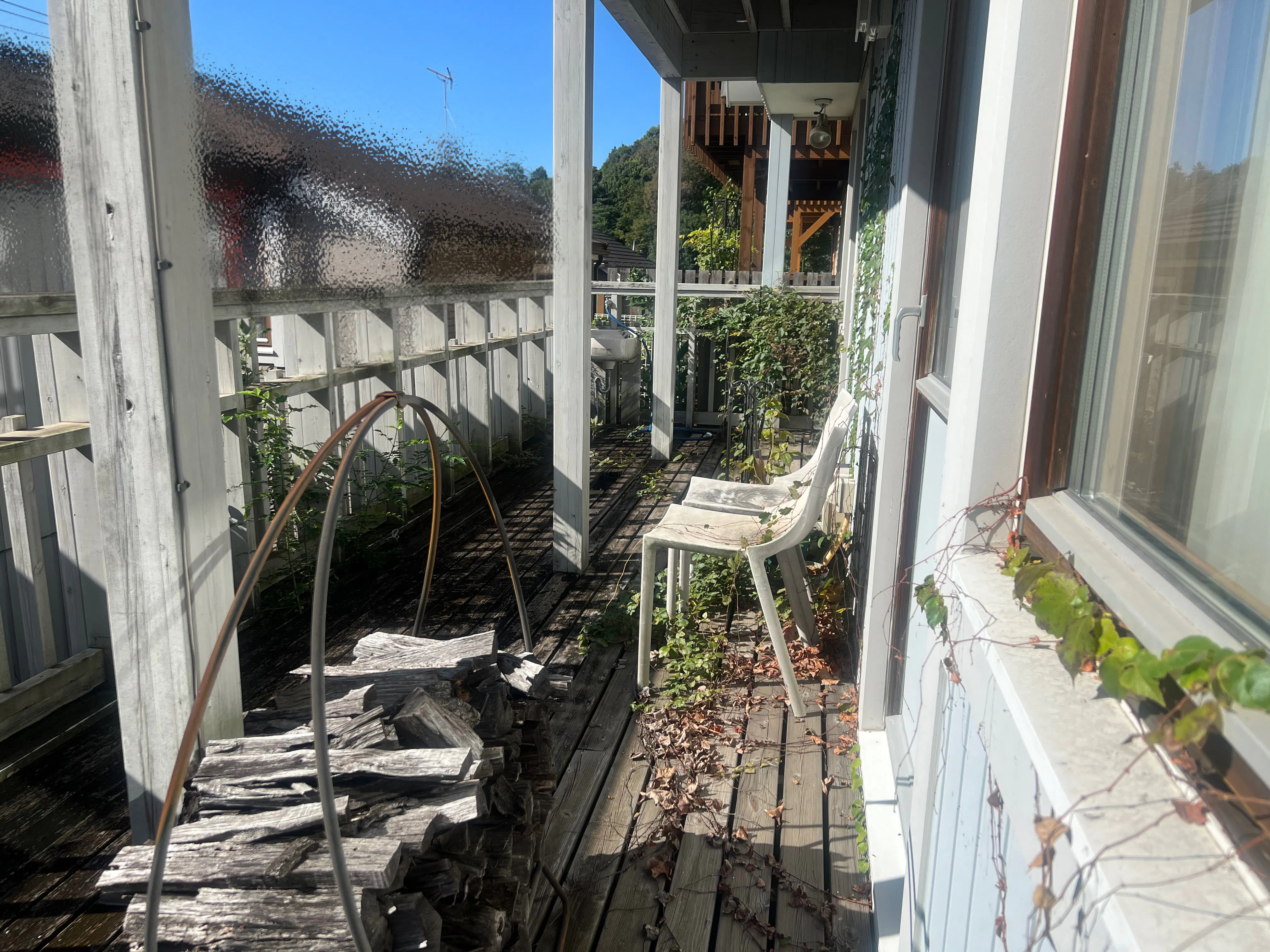 このデッキは腐敗しない部材に交換し、手すり部分の塗装をします。