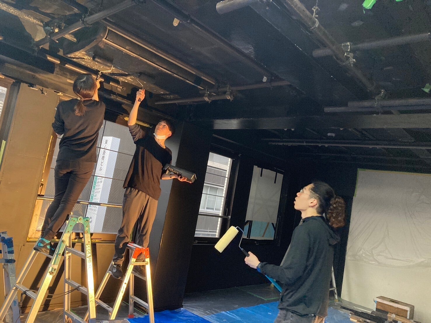 「若手」と「劇団」について話しながら、天井を塗っていきます!