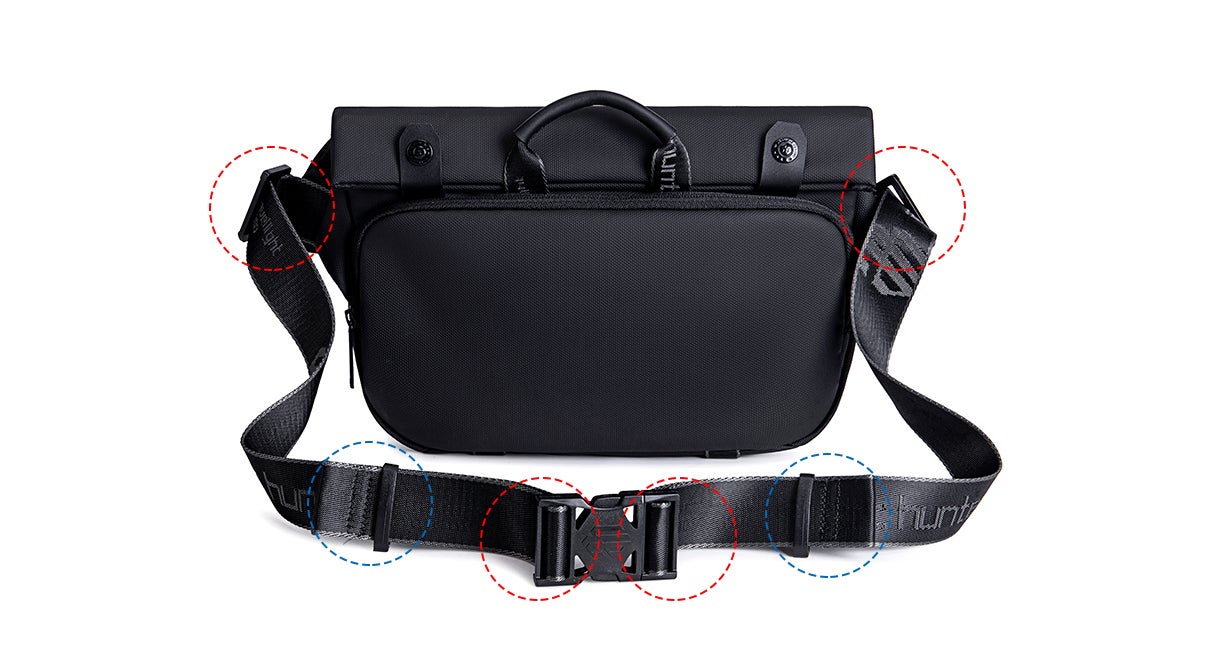 上記写真の赤い位置でストラップの長さが調整でき、青い位置で余分に伸びたストラップをまとめられます。