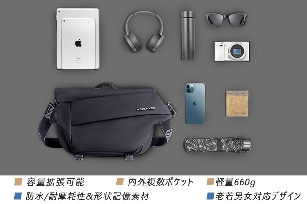 今回掲載頂きました、便利な容量拡張式クロスボディバッグ、このバッグはメンズ、レディースを問わないシンプルなデザインなので、どんな服装にも合わせることができます。さらに内ポケット多めの大容量な構造になっているので、出先で荷物が増えるかも、という余計な心配はいりません。とりあえずこのバッグに荷物を入れて外出すればいいや、という心意気でコーディネートが終わるのでちょっとしたお出かけのときはとても楽です。それでいて、様々な季節に対応した生活防水機能を備えています。便利で機能性も高く、非常に良い商品だと思います。