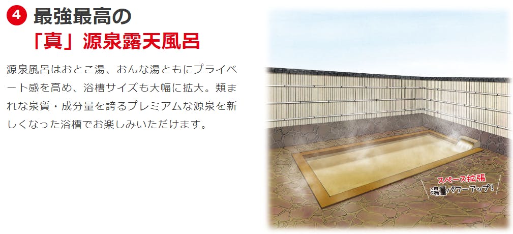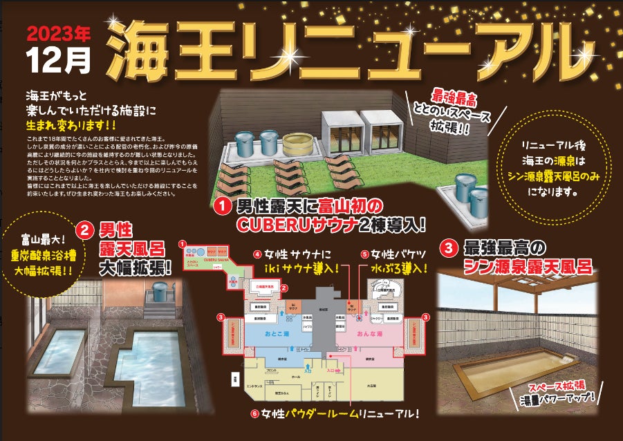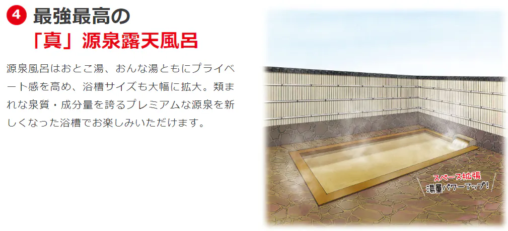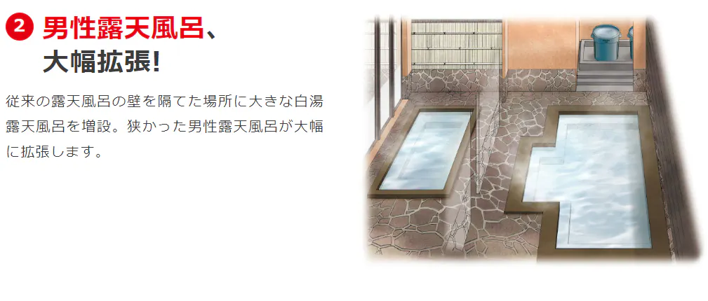 今回のリニューアルでは「男性の露天風呂が狭い」 という長年の課題解決をメインに老若男女全ての方に喜んでいただける7つのリニューアルでさらに「最強最高」な施設へと生まれ変わります!