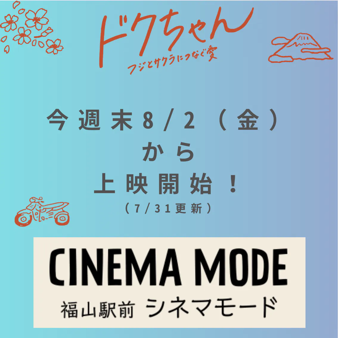 『ドクちゃん -フジとサクラにつなぐ愛-』は、5/3から全国公開を始めて以降、おかげさまで北は札幌、南は那覇の全国の劇場にて上映していただき、いよいよ今週末からは順次公開最終地となる、広島県の福島駅前シネマモードにて上映を開始します。