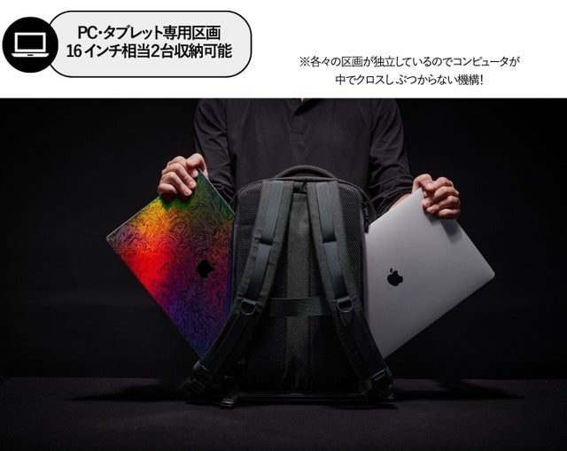 驚きの機構です。背面部にPC用の収納区画が2つ隠されています。MacBook16インチ相当が2台同時に収納可能。2台の区画はそれぞれ独立しているので、端末が中でクロスしぶつからないのです。