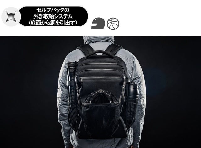 内蔵しているセルフパッカブルの網を引き出すことによって、ヘルメットやサッカーボール等の大きいアイテムを収納できます。