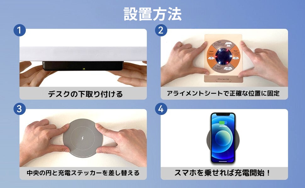 充電器本体を机の下に貼り付けることで、机の上のスペースを独占することなく、スマートフォンの充電が可能となります。