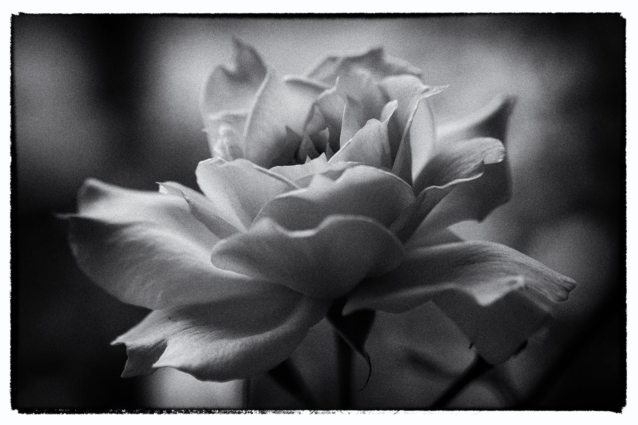 色情報というものは強力です。グラスに注いだワインの色を撮り続けている写真家もいるくらいですから、色だけで成り立つ写真もありますし、逆に言うと、色がなければ成り立たない写真も少なくないでしょう。その色情報を排除したのがモノクロ写真。さらに、このバラの写真で言えば、ボタニカルアート様式の特徴である細部の精細描写も捨てています。加わったのは、プラチナプリントの雰囲気。