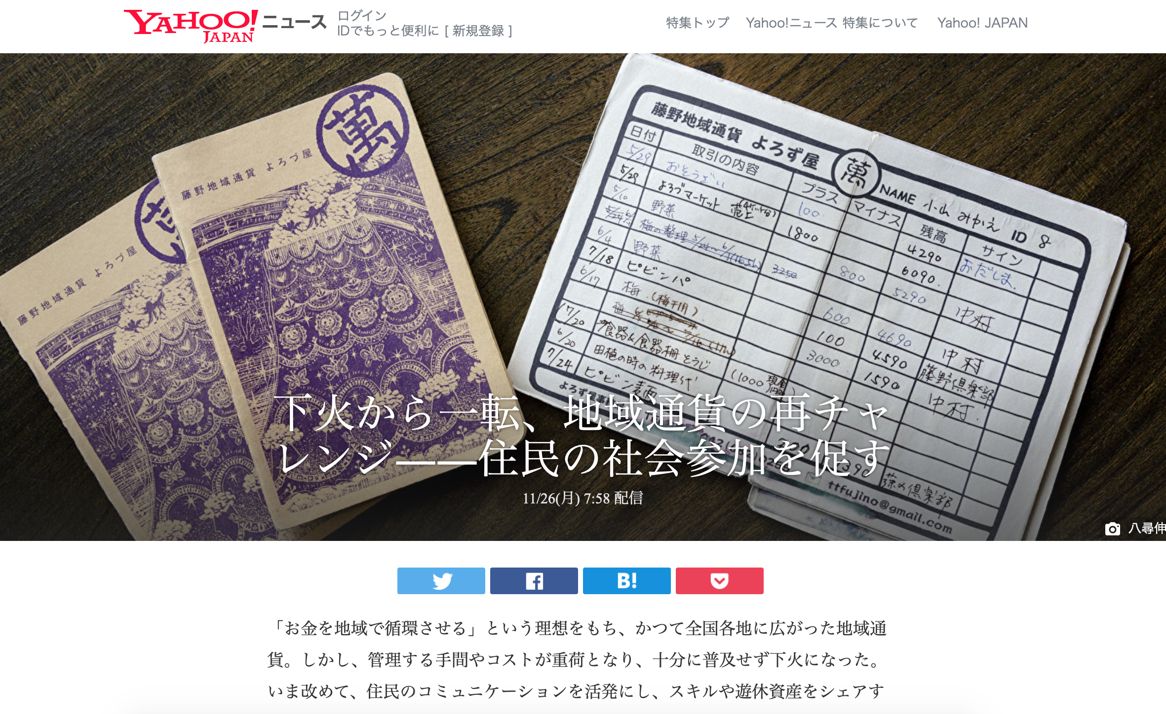 こんばんわ。土屋です。いよいよ。クラウドファンディングも残り5日となりました。たくさんの応援・シェアありがとうございます。今朝、ヤフー・ニュースさんに地域通貨の取組を大きく取り上げて頂きました。クラウドファンディングの本文中でも登場した藤野地域通貨よろづ屋のことです。このネットワークがなかったらビオ市の安定開催・集客は不可能でした。このクラウドファンディングもよろづ屋の存在に助けられています。下火から一転、地域通貨の再チャレンジ――住民の社会参加を促す2018年11月26日(月)「お金を地域で循環させる」という理想をもち、かつて全国各地に広がった地域通貨。しかし、管理する手間やコストが重荷となり、十分に普及せず下火になった。いま改めて、住民のコミュニケーションを活発にし、スキルや遊休資産をシェアするツールとして、また住民の社会参加を促すといった目的で見直されつつある。アナログな台帳型、IT技術の普及による電子決済型など形はさまざまだが、「持続可能な地域社会づくり」を目標に再興しつつある。(ジャーナリスト・田中徹/Yahoo!ニュース 特集編集部)https://news.yahoo.co.jp/feature/1152