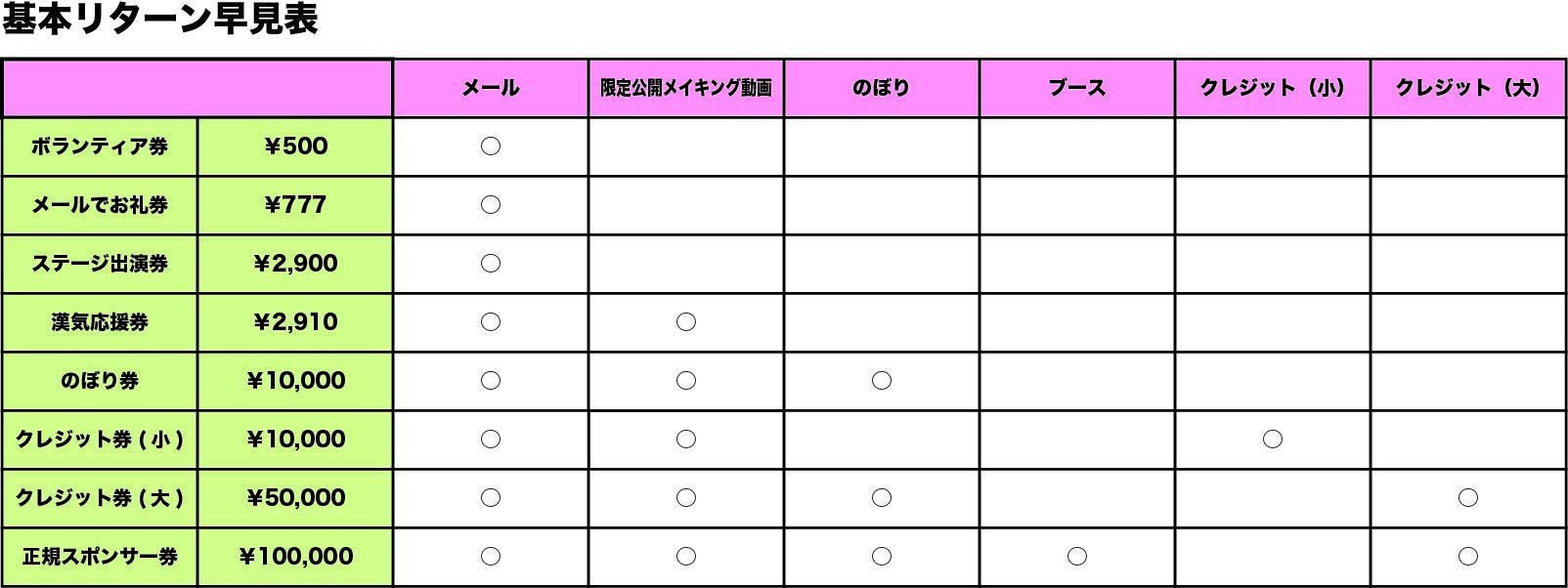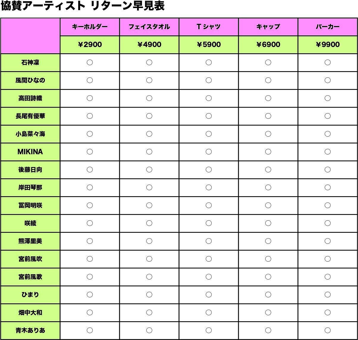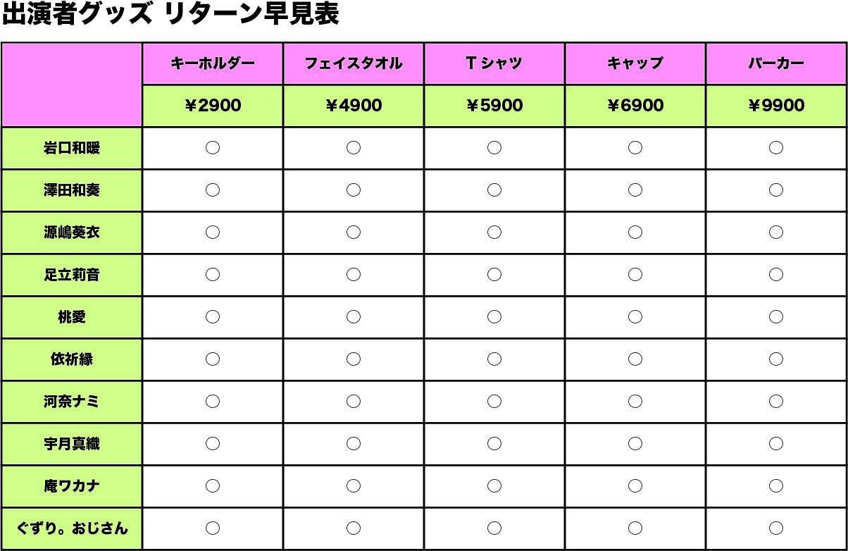 基本リターンの他に、出演者のサイングッズ、また、協賛者のサイングッズ、そしてコラボグッズを追加しました。