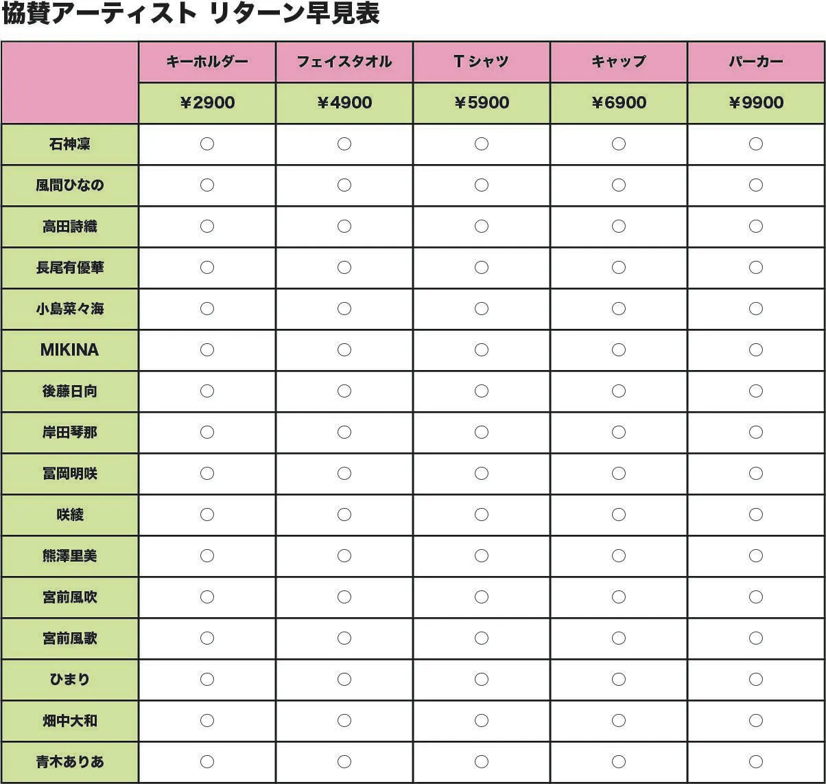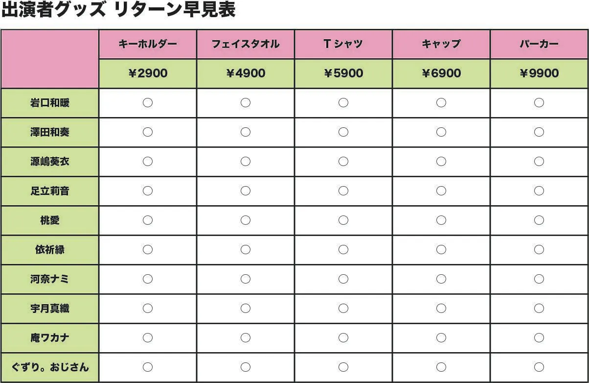 基本リターンの他に、出演者のサイングッズ、また、協賛者のサイングッズ、そしてコラボグッズを追加しました。