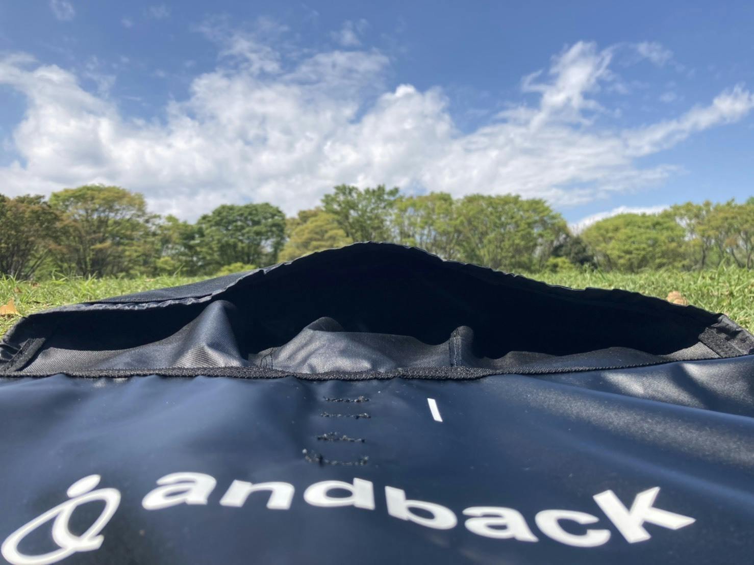 andbackは、風呂敷タイプで大きく開くため、その上で着替えることができて、砂や砂利がつきにくく快適。