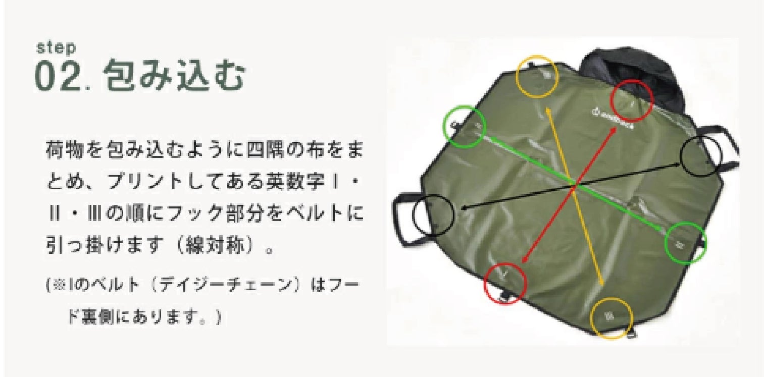 荷物を包み込むように四隅の布をまとめ、プリントしてある英数字Ⅰ・Ⅱ・Ⅲの順にフック部分をベルトに引っ掛けます(線対称)。