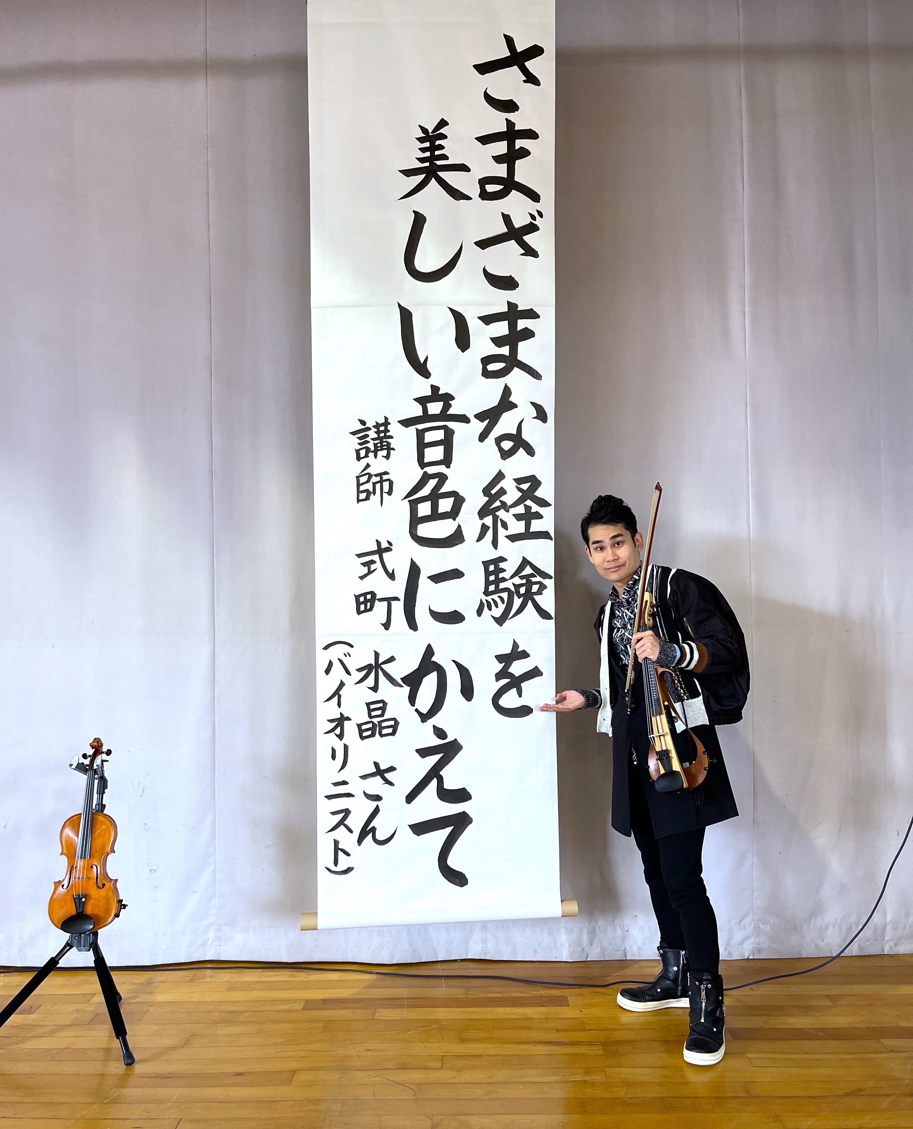 学校での講演・演奏の際、垂れ幕を生徒さんが書いてくださることも