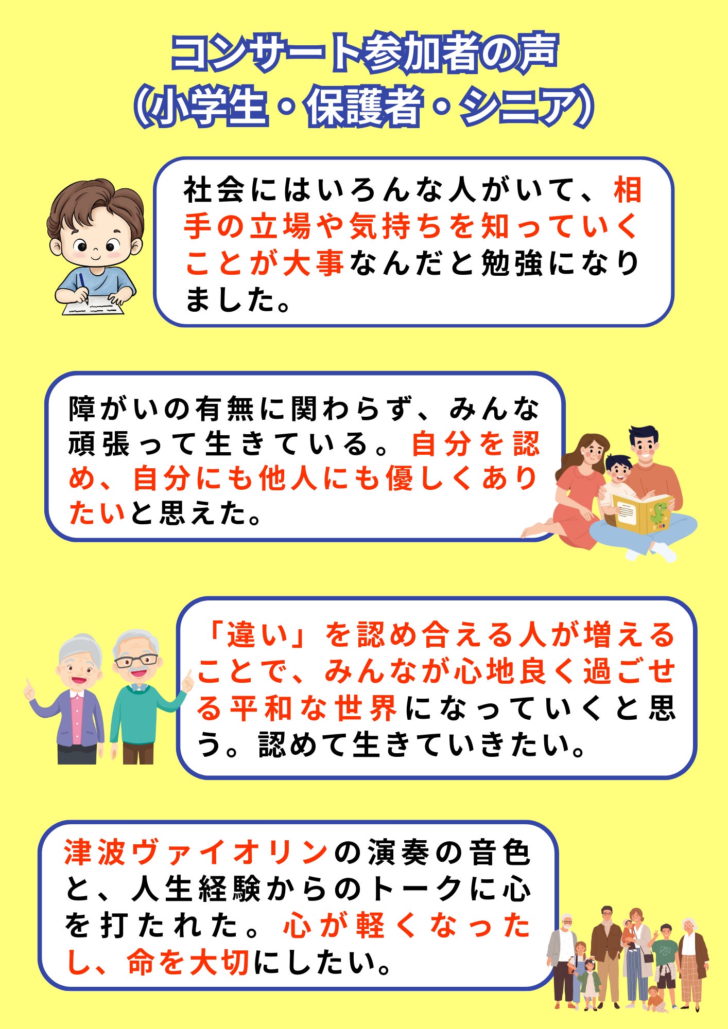 社会の波動を優しく、あたたかいものにしていきたいと思い、学校訪問での講演・演奏会や、人権セミナー、防災イベントで講演・演奏活動をしてきました。その中で、次のようなご感想をいただいています。