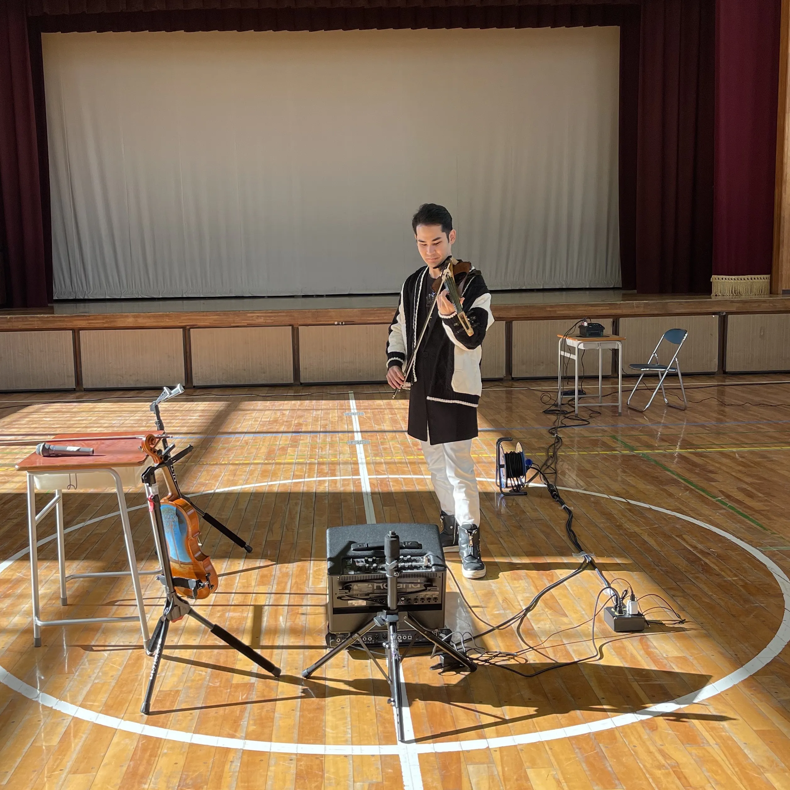 また、体育館でのヴァイオリンの演奏中、ぼくは、コミュニケーションの気持ち、ヴァイオリンの音色を身近に感じてもらいたいという想いから、生徒の皆さんお一人お一人の目の前を歩いて演奏することをしています。