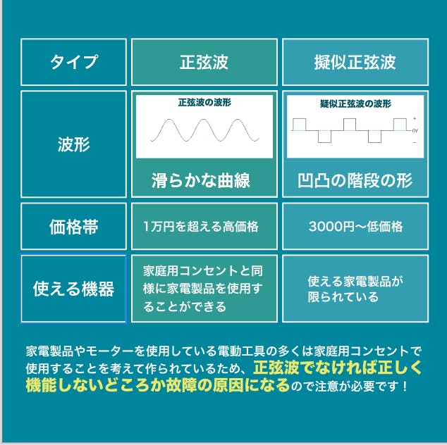 ポータブル電源(DC電源)を家庭用コンセント(AC出力)に変換する装置が【インバーター】です。このインバーターから流れる電気の形状を「波形」と言います。波形は主に「正弦波」と「擬似正弦波」に分かれます。