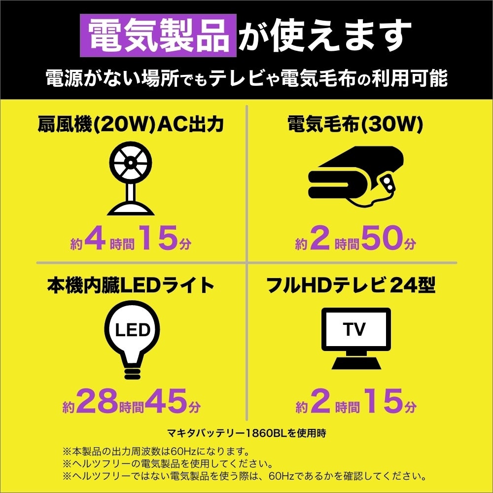 電気製品の使用時間はバッテリーの容量と使う電気製品の消費電力(W)によって決まります。