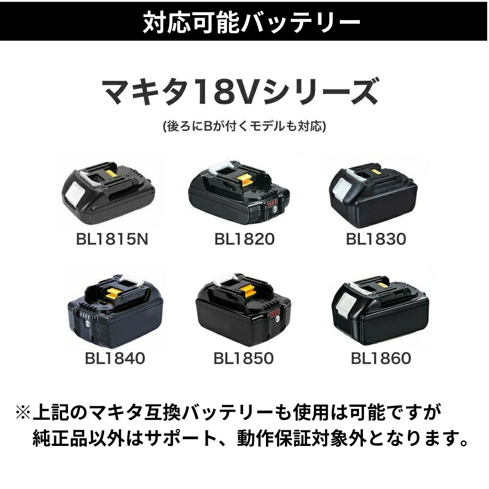 ※ ご注意: 本製品はマキタ純正の18Vバッテリー用です。マキタ純正品以外の互換バッテリーは動作保証していません。またマキタ純正バッテリー以外で使用された場合の事故やトラブル等について、当社は一切責任を負いません。また、マキタ純正バッテリー以外で利用できない場合での返金やキャンセルも承っていません。以上、予めご了承くださいませ。