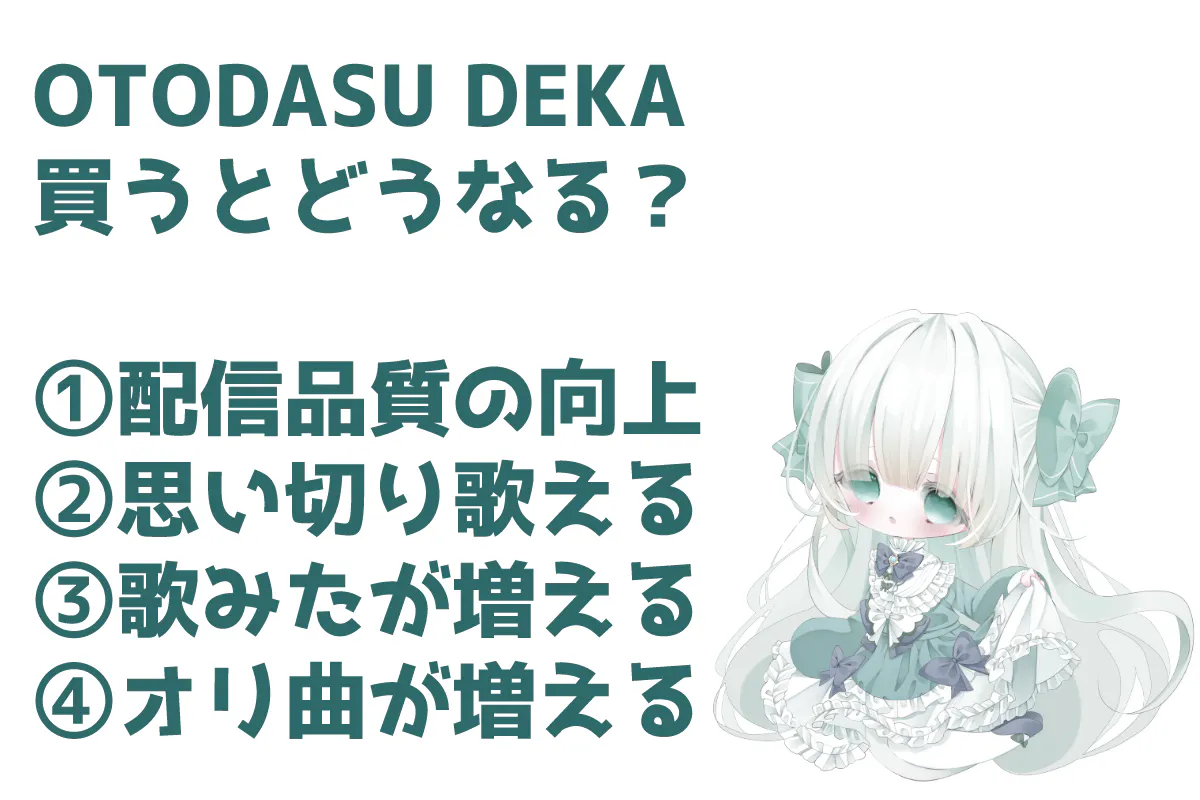 簡易防音室「OTODASU DEKA」を購入することにより、歌枠で思い切り歌えるようになりますし、ASMR配信やシチュエーションボイス動画の音の品質が向上します。また歌ってみたやオリジナル曲の収録が自宅で行えるようになるので、楽曲を出す頻度も上げることができると考えています。