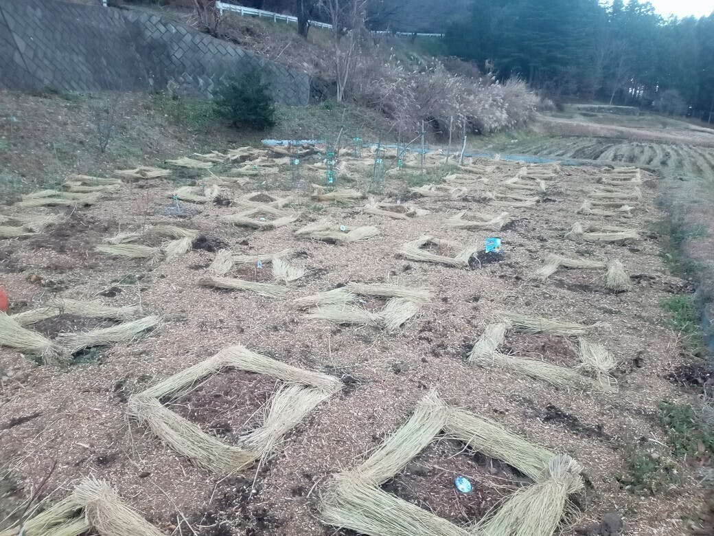 ブルーベリーの周りに藁を置きましたが、これは苗木が小さいため見失わないようにする目印と、根元の風よけとしておきました。こうしておくと一目でどこに植わっているのかわかりやすいです。