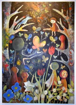 今回は「森」をテーマにしており、この作品展のために、103cm×73cmの作品1点と、ポストカードサイズの新作を12点ご用意いたしました。