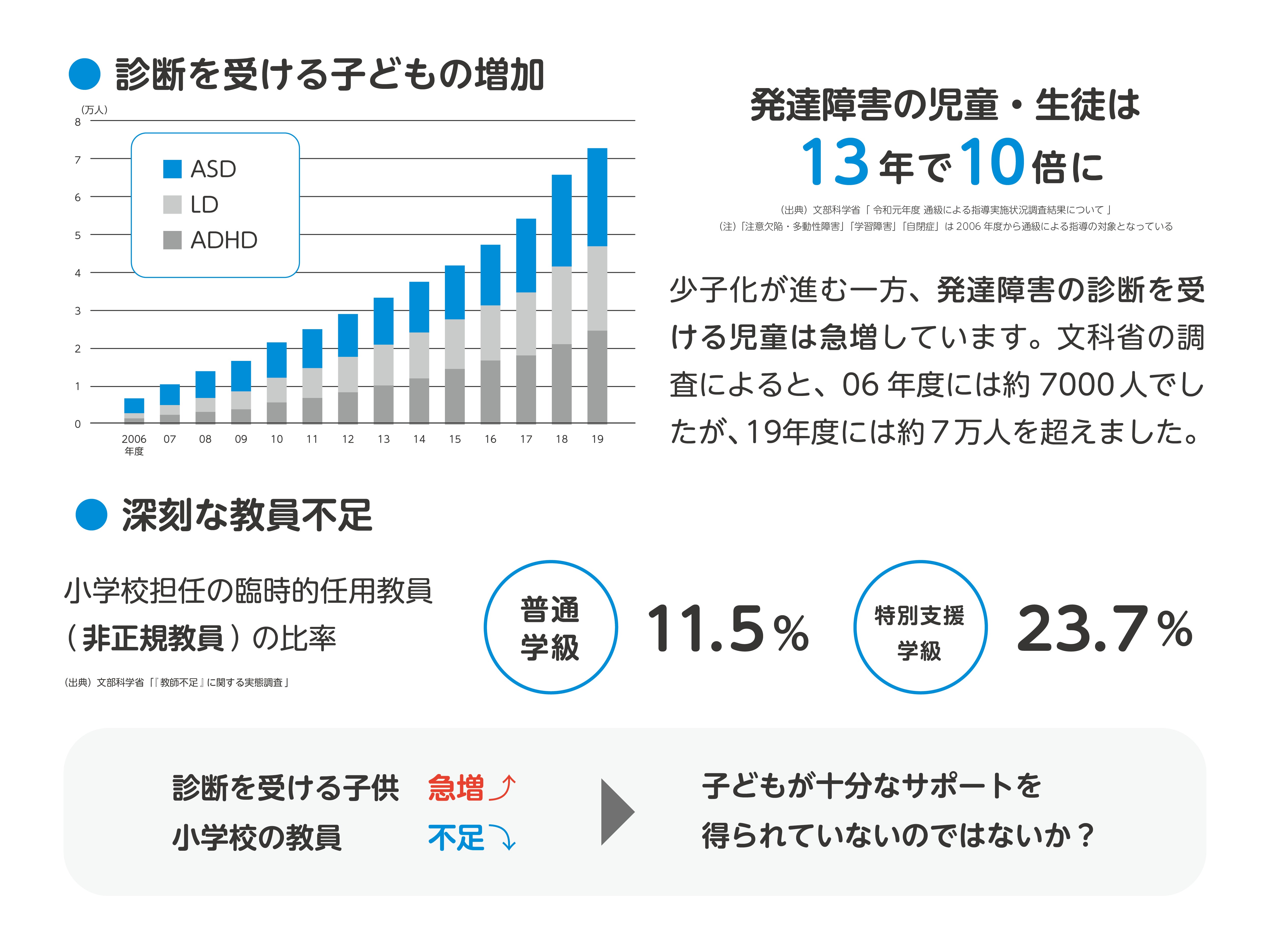 現在、発達障害の診断を受ける児童は急増し、文部科学省の調査によると13年で10倍になっています。また教育現場では教師不足が深刻です。現状の学級体制では、特性をもつ児童も周囲の児童も十分なサポートを得られていないといえます。