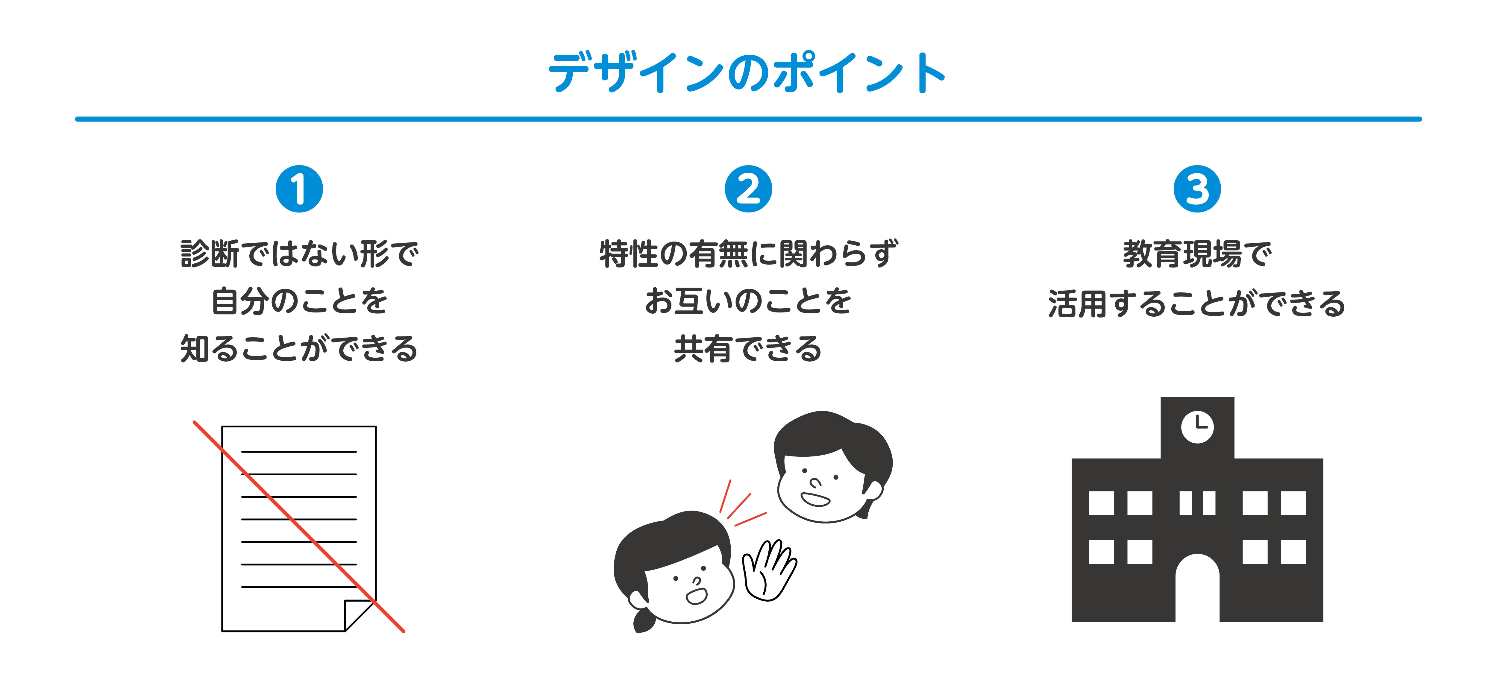 子ども同士で気付き・配慮しあう段階へ至るため、まず特性の強弱を問わずに小学生が自分や友達のことを知る機会を得られるようにすることを決めました。