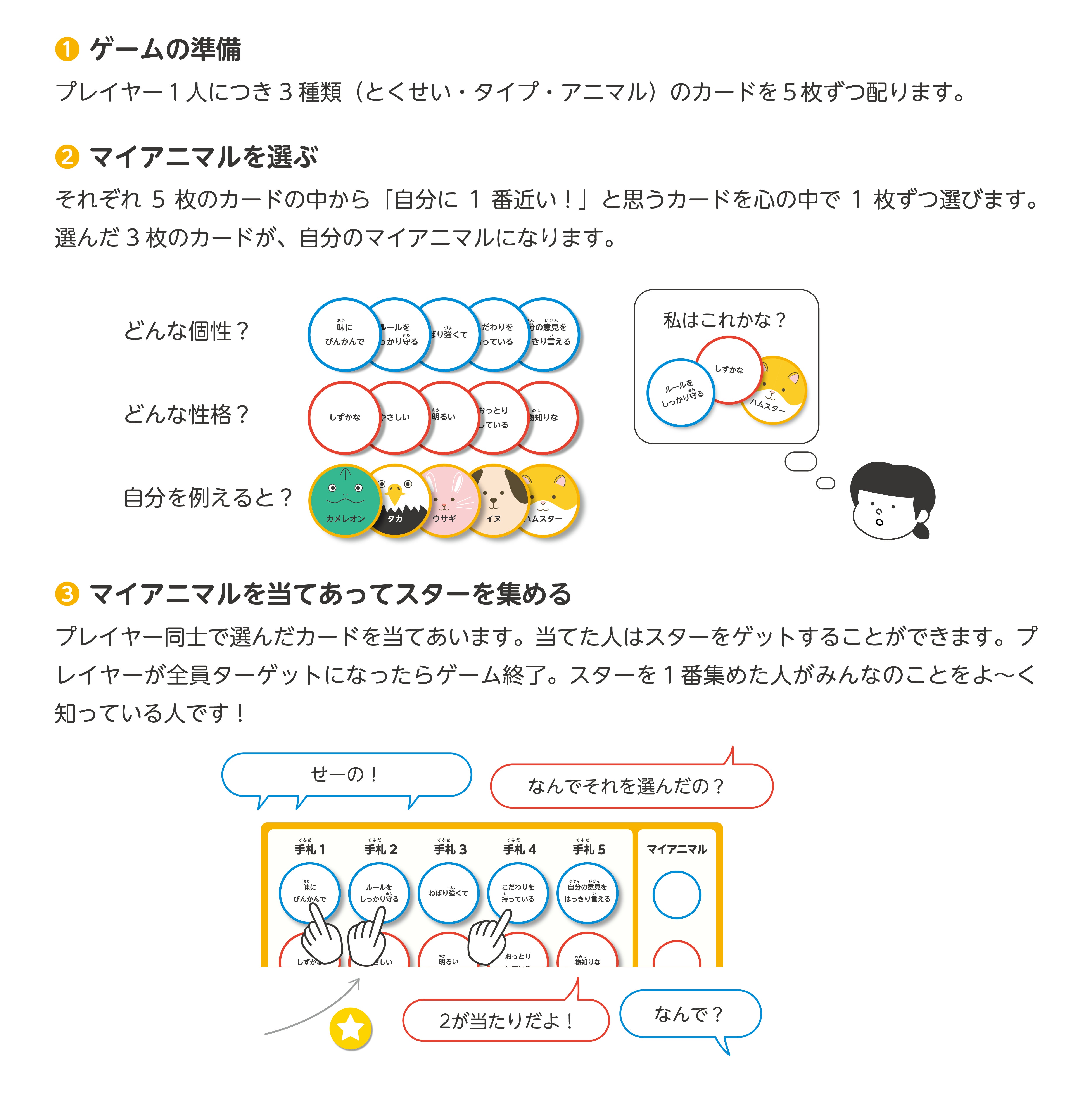 自分って、友達って、どんな人なんだろう?そんな思いにポジティブに応えるカードゲームです。子どもの自己理解と他者理解を進め、自分のことを相手に伝えることを目的としています。