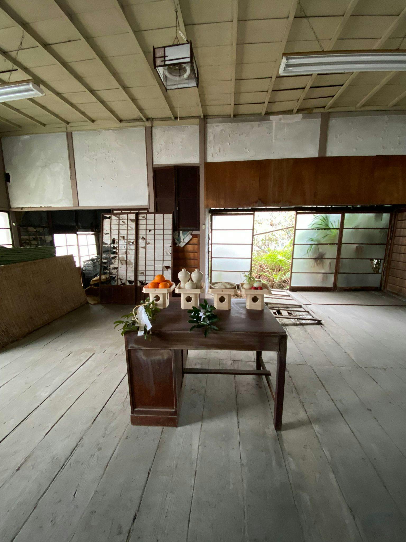 工事を始めるにあたり、中島大浦の「忽那島八幡宮」にお願いして工事の無事を願う神事を、こちらの建物の所有者でいらっしゃる堀内ご夫妻もご参加いただき執り行いました。