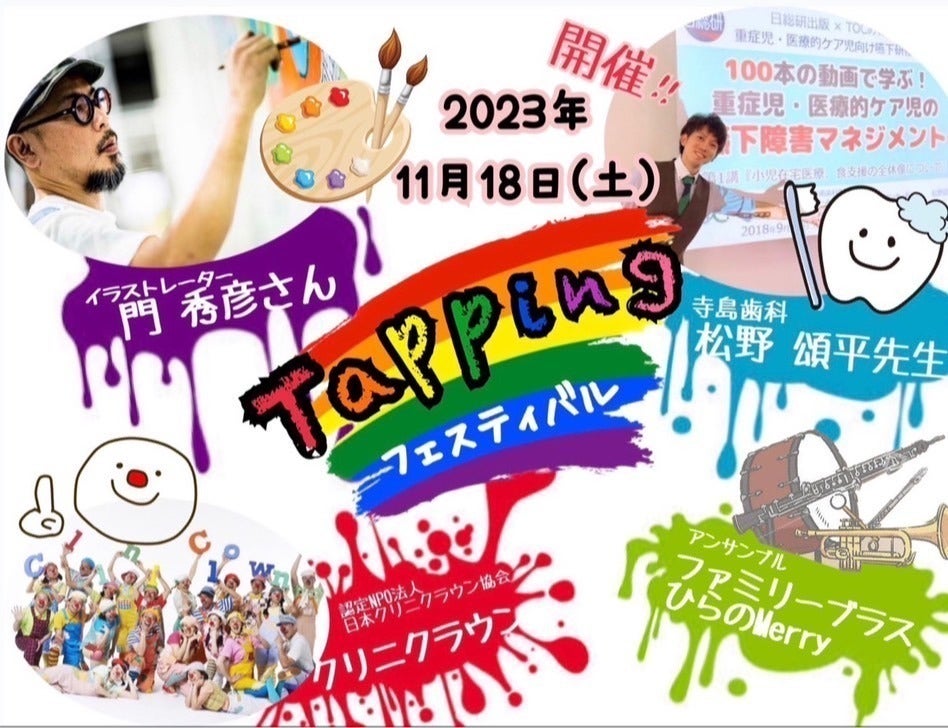 「Tappinngフェスティバル」では、絵描き/イラストレーターである、門 英彦様による「子どもたちと一緒につくるライブペインティング」をはじめ、ファミリーブラス平野Merry様の木管アンサンブル演奏、認定NPO法人日本クリニクラウン協会様の「みんなであそぼうこども時間」と大阪府下の重度心身障害児者と医療ケア児者の子どもたちが本気で楽しむ時間を、また、保護者様には、普段聞けない食事についての相談(口から食べることや簡単に柔らかくする家電調理体験など)を受けるブースを設けます。