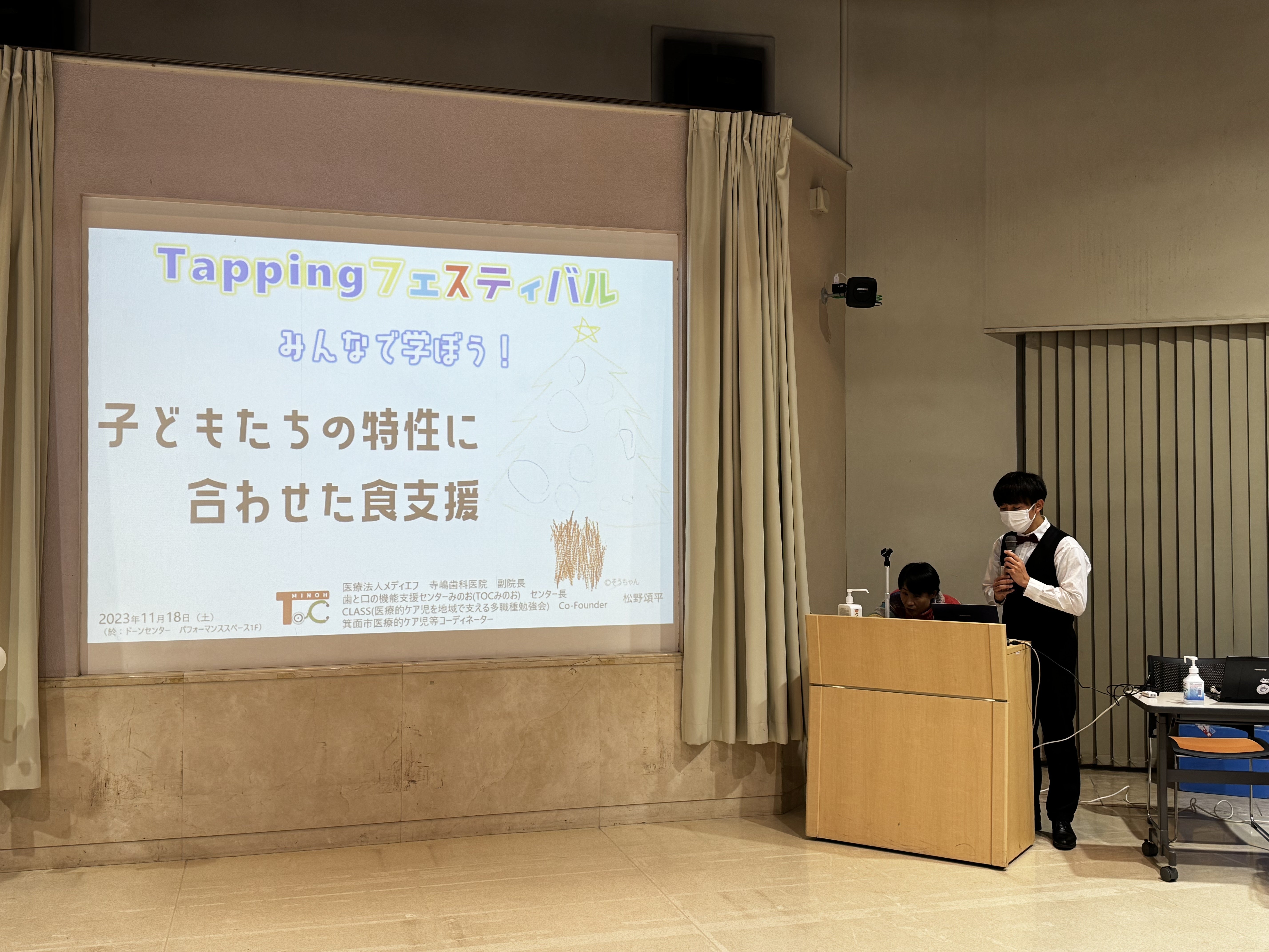 2023年11月18日㈯に開催しました「Tappinngフェスティバル」の活動報告です。子どもたちが絵を描いている最中、保護者や支援者対象に寺嶋歯科医院の松野先生による「子どもたちの特性に合わせた食支援」をテーマに講演していただきました。日ごろ子どもたちのお世話をしていて、専門家による支援のお話を聞くことが少ないので、皆様真剣に聞いておられました。