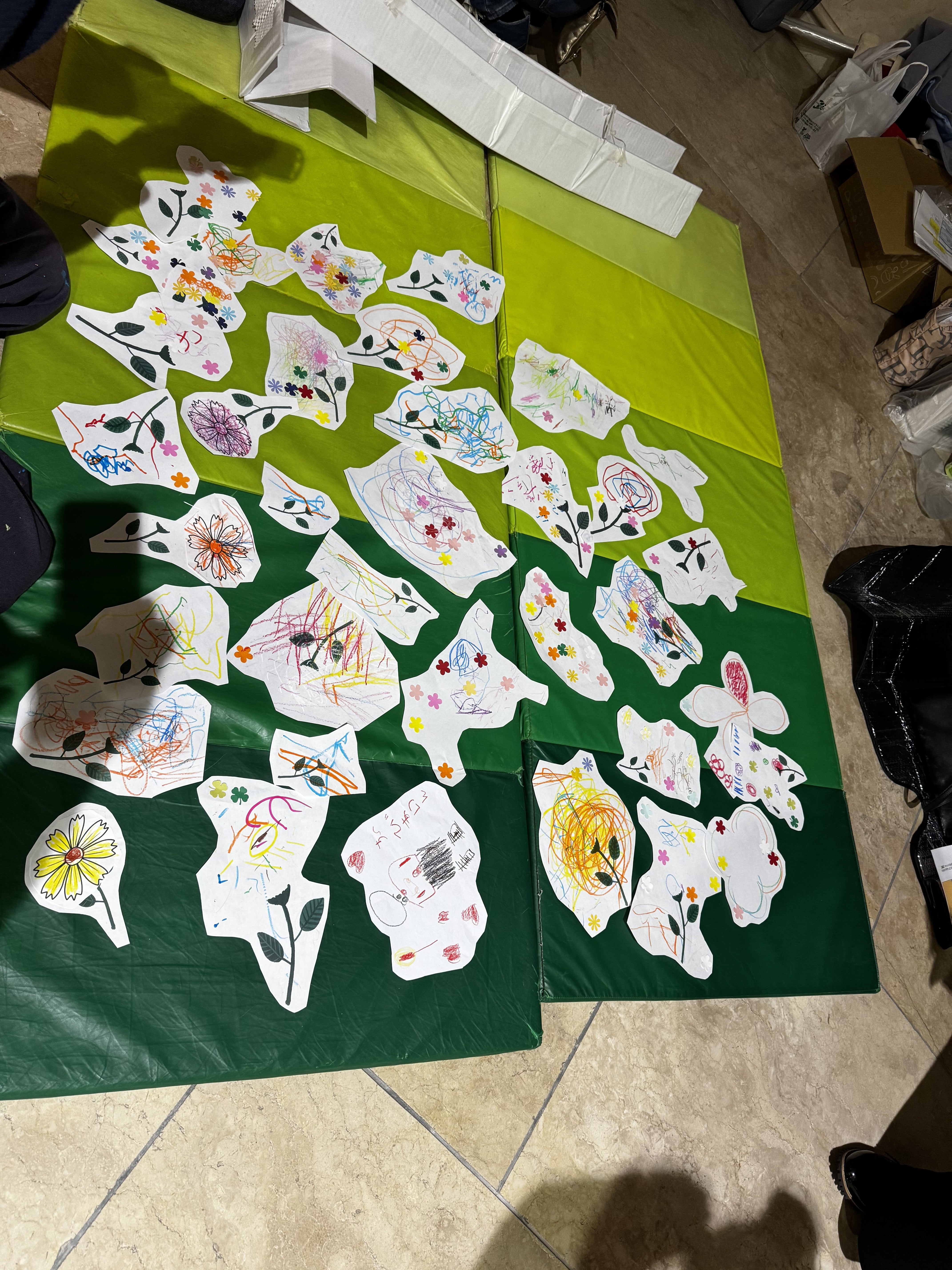 キャンバスに描く前に、各事業所で参加できない子どもたちが、花をモチーフにした絵を描いて持ってきました。