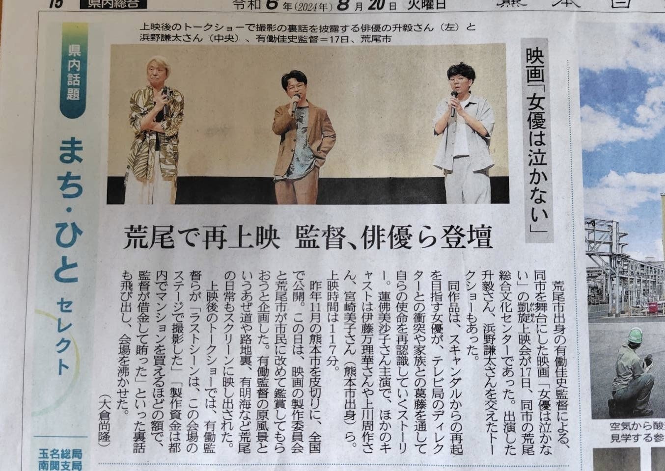 2024/09/21 22:04『荒尾凱旋上映会』2024年8月17日(土)ロケ地である熊本県荒尾市の総合文化センターにて、無料上映会を行いました。会場まで応援に駆けつけてくださった升毅さん、浜野謙太さん。お盆の暮れの忙しい時期にも関わらず、多くの地元の方々にお越し頂きました。劇中に出てきた「焼き飯」のブース、「猿拓タクシー」を背景に多くの方が記念写真を撮ってくださり、改めてこの作品が地元に愛されて戻ってきたように感じました。『湯布院映画祭』歴史ある第49回湯布院映画祭に、特別上映枠でご招待頂き、参加しました。有働監督、出演者で九州ご出身の吉田仁人さんと、木滝プロデューサー上映後には湯布院映画祭ならではのシンポジウムが開催され、映画祭に申し込みをされた一般のお客様とディスカッションをするという大変貴重な経験をさせていただきました。映画の上映開始から半年以上経ってもなお、このように皆様とお会いでき、作品はずっと生き続けると改めて思う時間となりました。 もっと見る