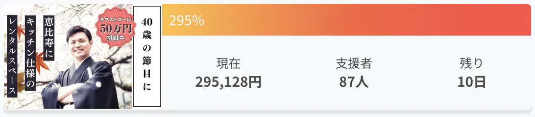 皆さんにご支援頂いたおかげで残り10日でセカンドゴールまで後5万5千円、100人まで13人まで来ております。ありがとうございます。