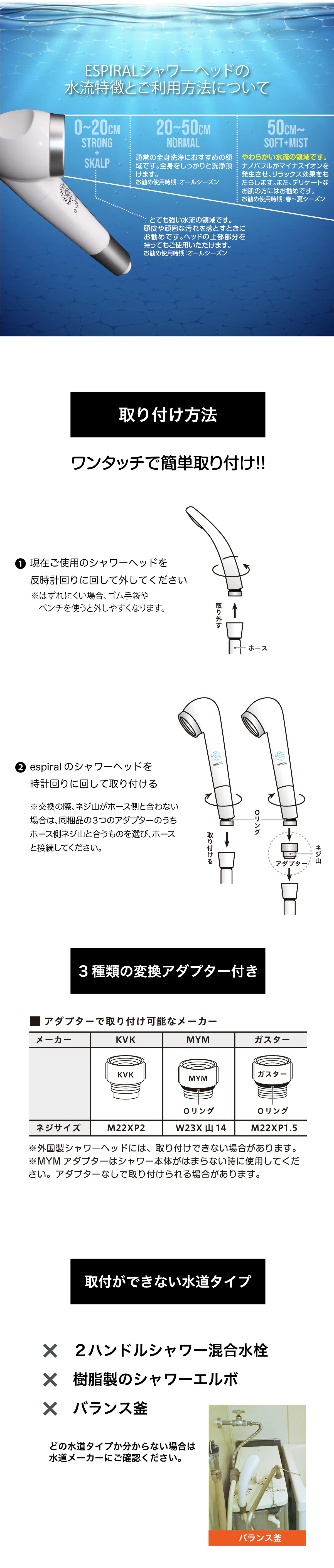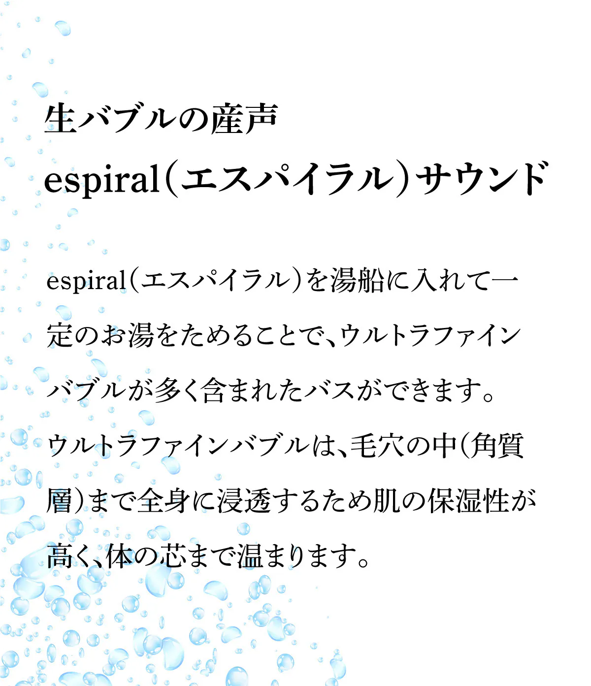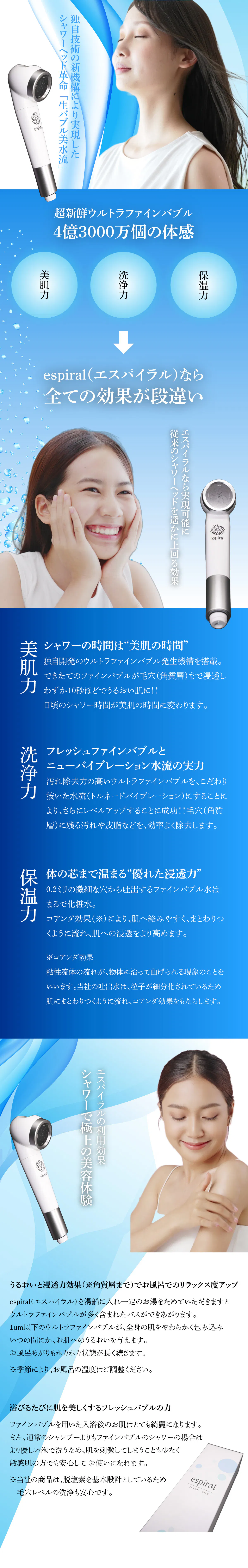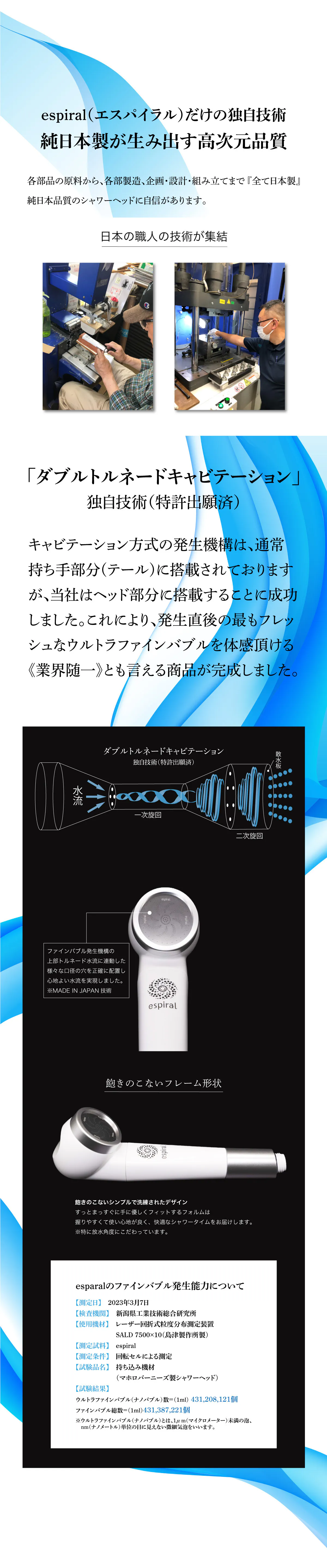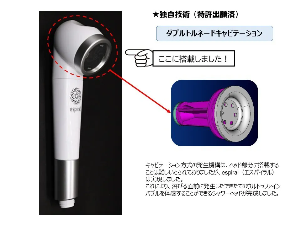 当社は、日本企業が持つ素晴らしい技術を繋ぎ合わせ、人々がより心地よく暮らせる商品やサービスを開発し届けることを目標に掲げ、2022年6月に創業をスタートしました。まず着手したのは、日本が世界に誇る「ファインバブル技術」の商品開発。メンバーは専門家3名(シャワーヘッド製造会社出身2名、ファインバブル研究&技術者1名)。お洒落でかつ究極の美容シャワーヘッドを追求した結果、従来品の改良ではなくゼロからの設計を決断。更に素材から各部品に至るまで全てを日本製(純日本製)に拘りました。開発は困難を極めましたがついに完成。ぜひ、日本の技術の粋を集めたウルトラファインバブルシャワーヘッドを体感してください。