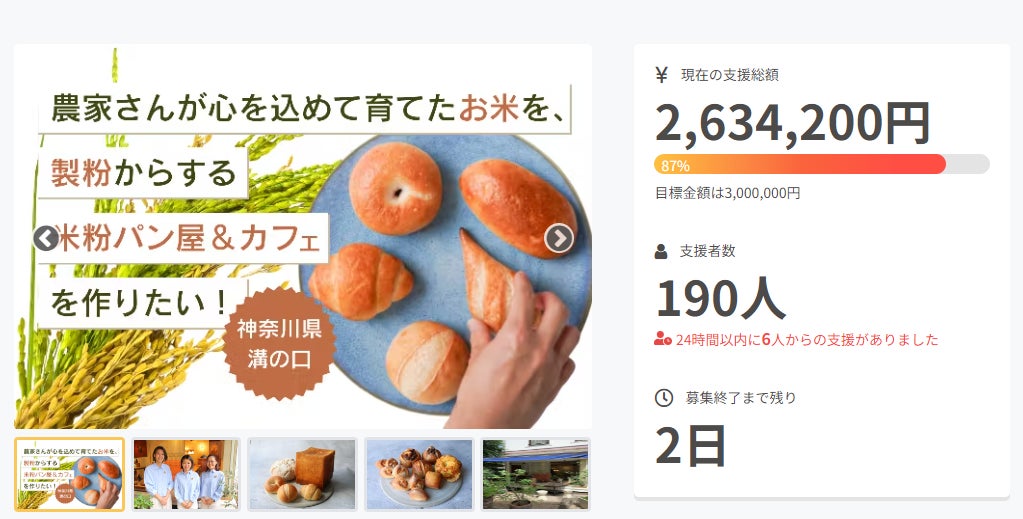 11月30日、無事クラウドファンディングが終了しました!最後まで、本当に多くの方にご支援・ご協力いただき、目標額を大幅に越え、400万円近くのご支援をいただくこととなりました。本当に感謝しかありません。お米農家さんがこだわりをこめて、想いを込めて作ったお米を製粉からする米粉パン屋をつくる。と決めてから、スタッフに支えられながらここまで走り続けてきました。まだまだ、ここからが本番。みなさまに美味しい米粉パンをお届けできるように、スタッフ一同お店作りをしていきます!こちらの活動報告でも引き続き店舗の進捗等を共有していきますので、楽しみにしていてください◎