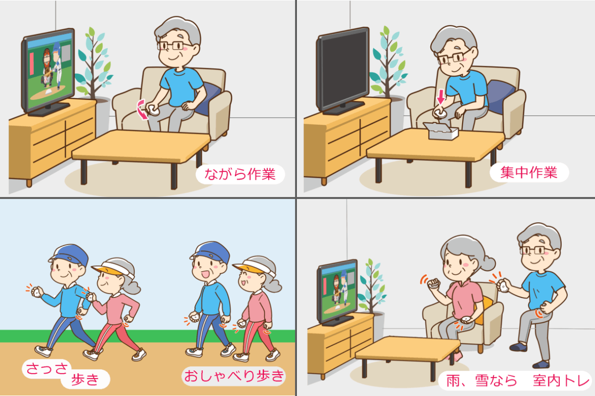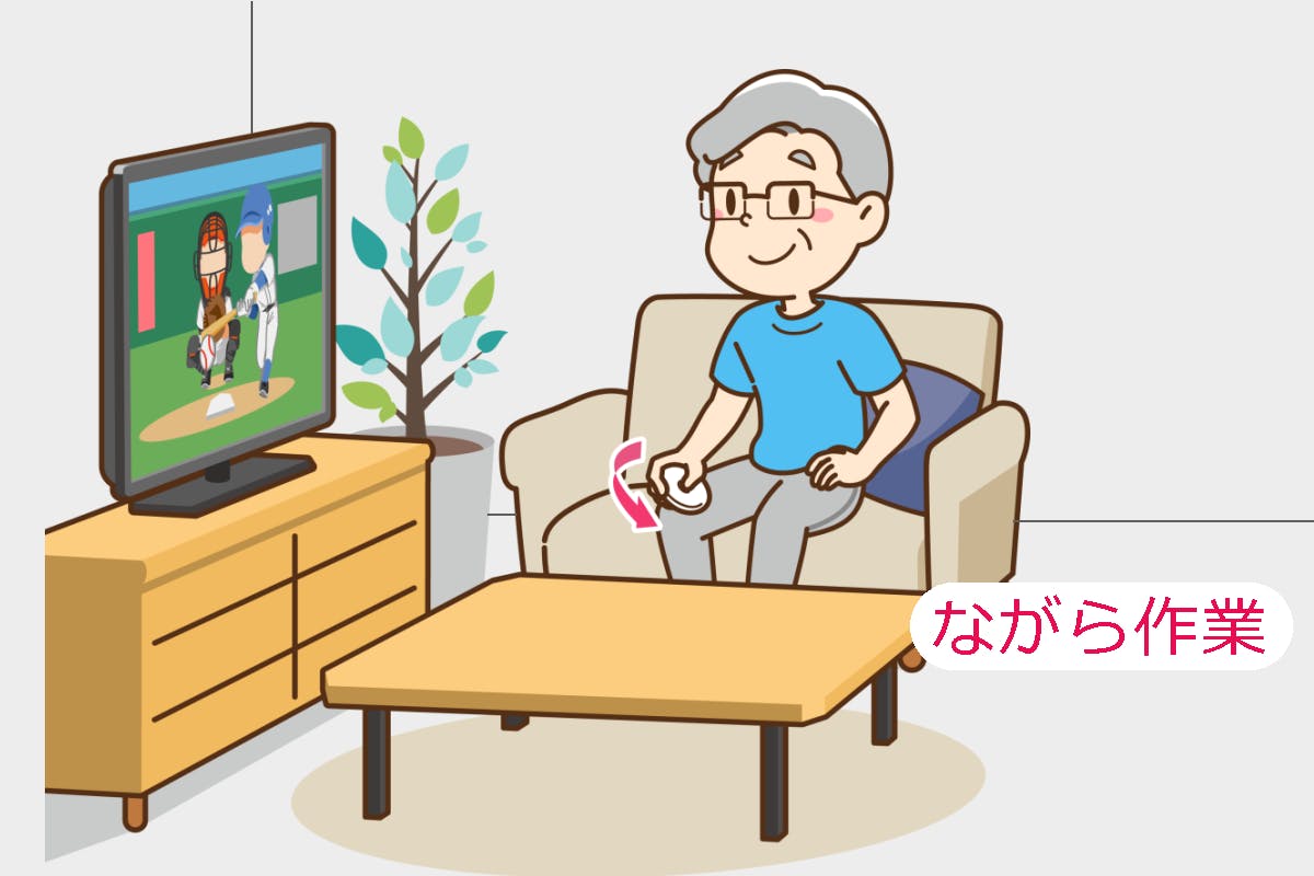 テレビを見ながら、会話をしながら、ツールを片手または両手で巧緻動作や握力作業を繰り返すデュアルタスク(同時に2つのことを行うこと)のトレーニングによって低下が進んでいる機能をサポートします。※高齢者の一日のテレビ視聴時間は約五時間半と言われております。 資料:NHK放送文化研究